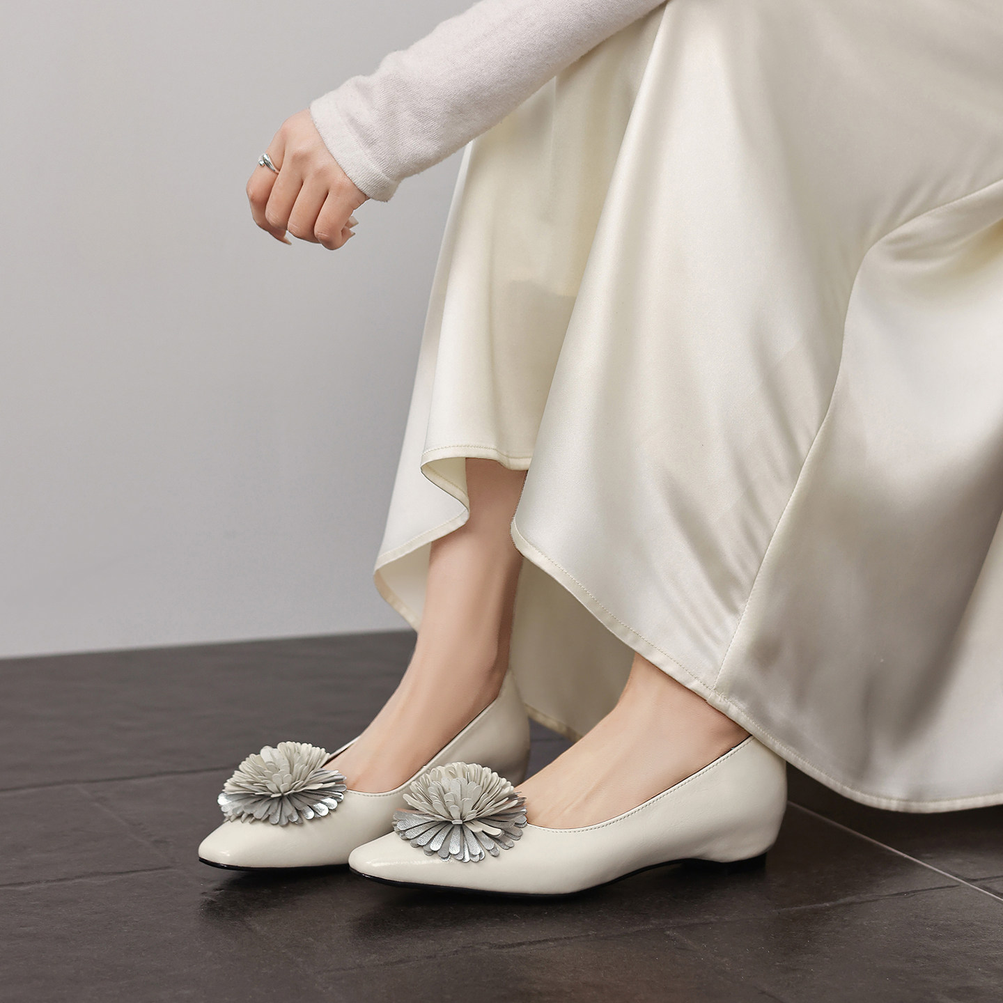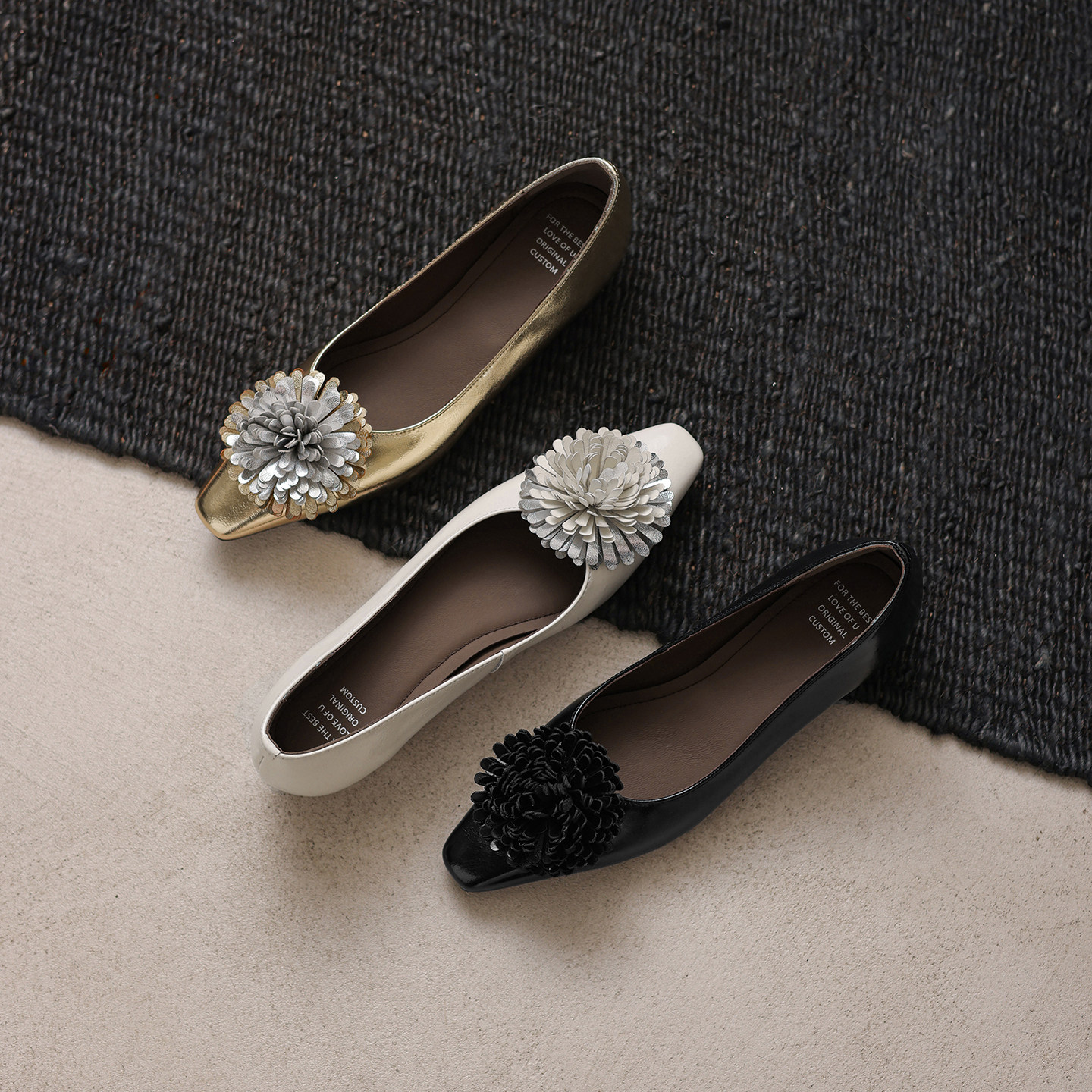 牛皮3cm内增高~法式花朵方头浅口单鞋女优雅舒适平底中跟玛丽珍鞋