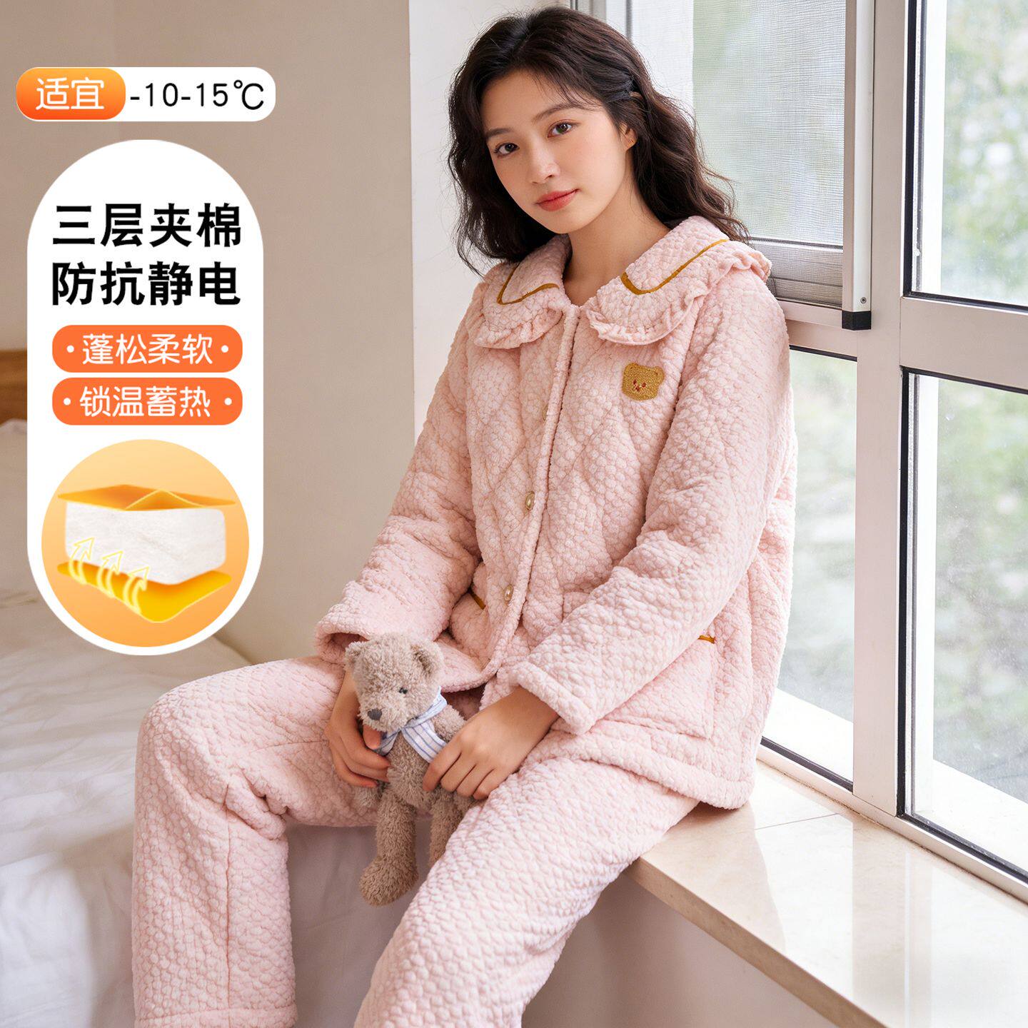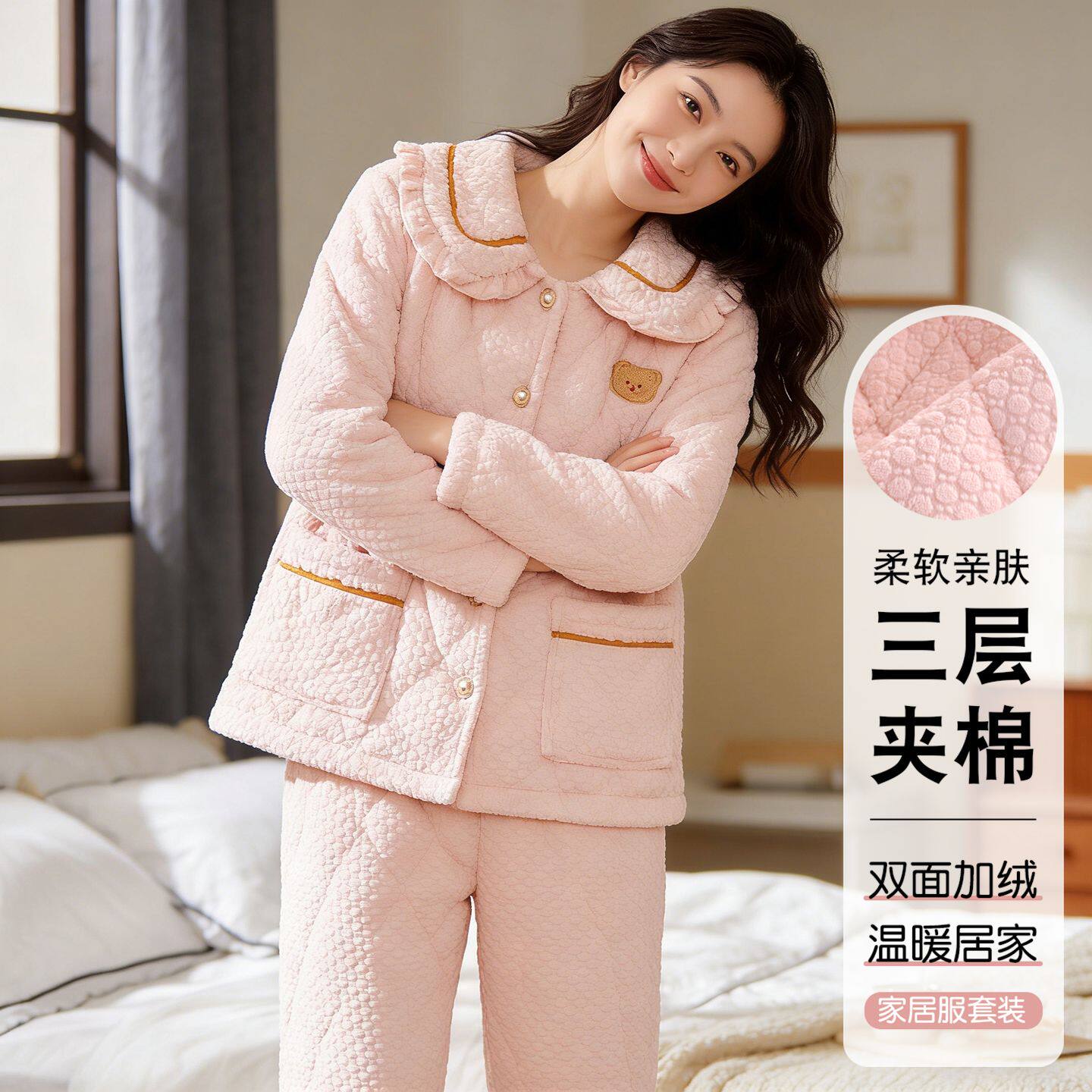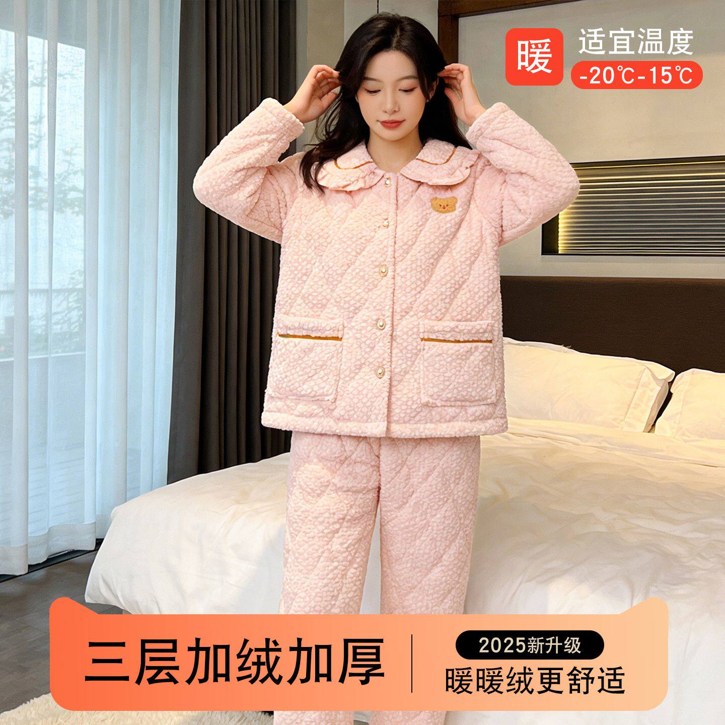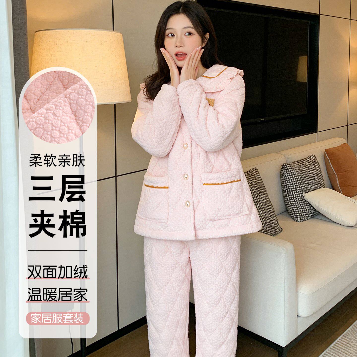 高品质三层夹棉加厚睡衣女冬特厚珊瑚绒时尚洋气家居服可外穿省服
