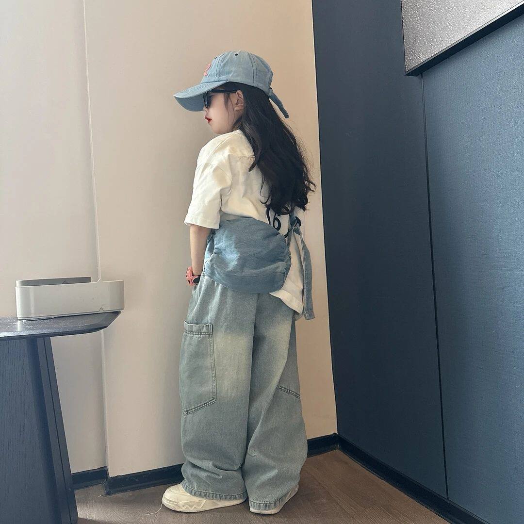 男女童潮酷夏季休闲宽松牛仔弯刀裤中大童洋气大版短袖T恤两件套