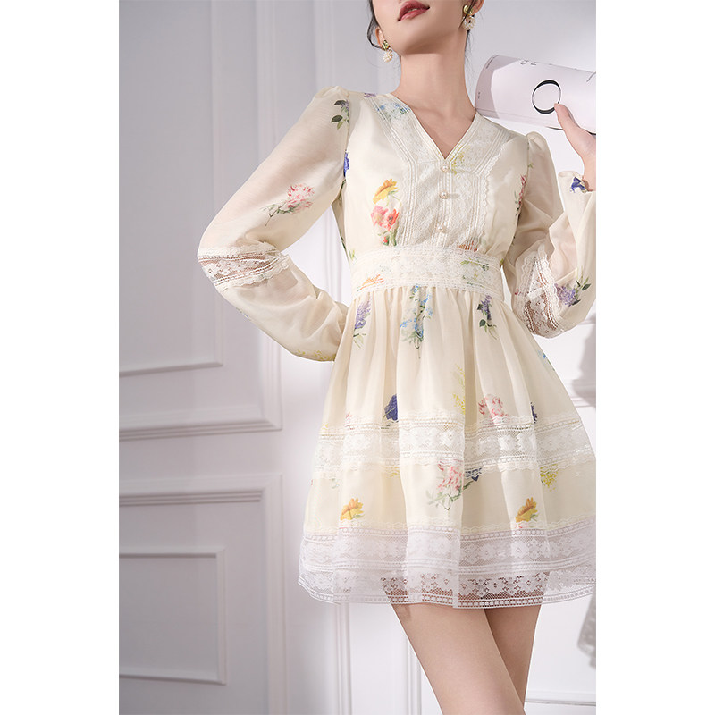 韩语琳印花拼接连衣裙2026新款今年流行爆款气质长袖收腰a字裙子