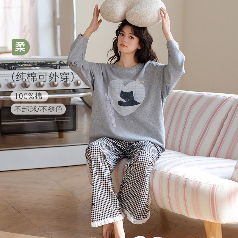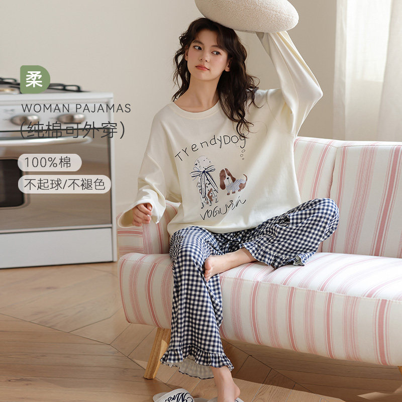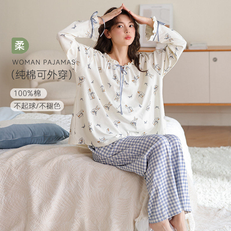春秋季纯棉睡衣女款2026新款长袖秋冬款家居服全棉可外穿休闲套头