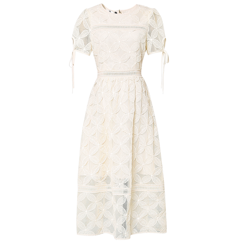 夏季女装2024新款气质OL杏色泡泡袖收腰显瘦镂空连衣裙长裙女