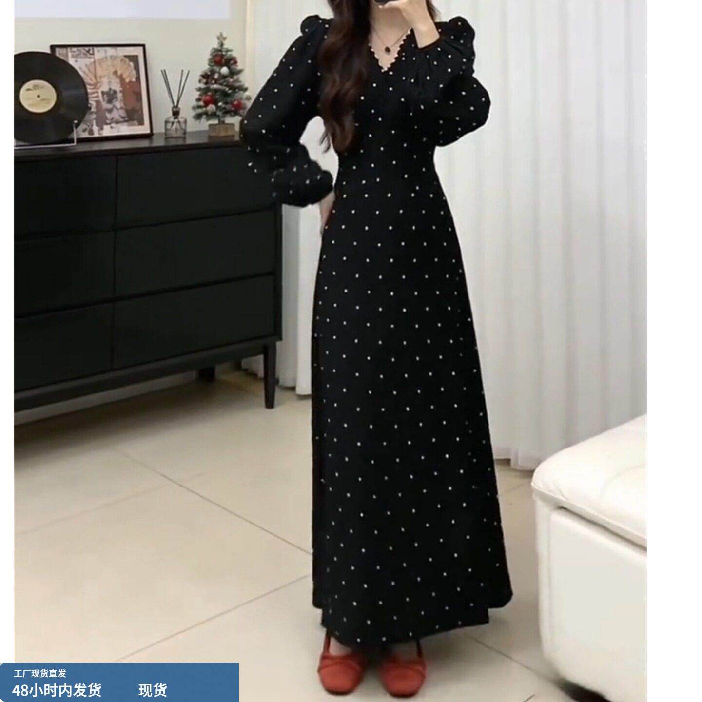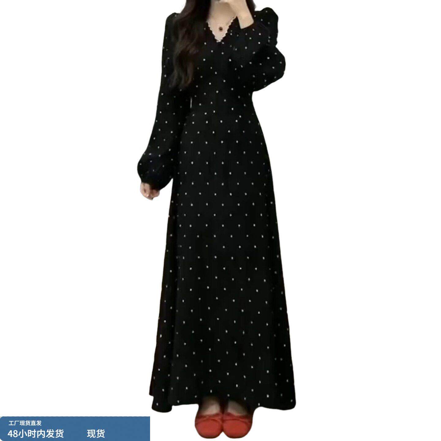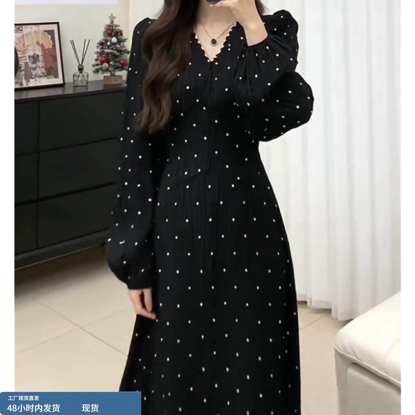 145小个子长袖连衣裙子女春秋150显高穿搭收腰法式显瘦A字长裙xs