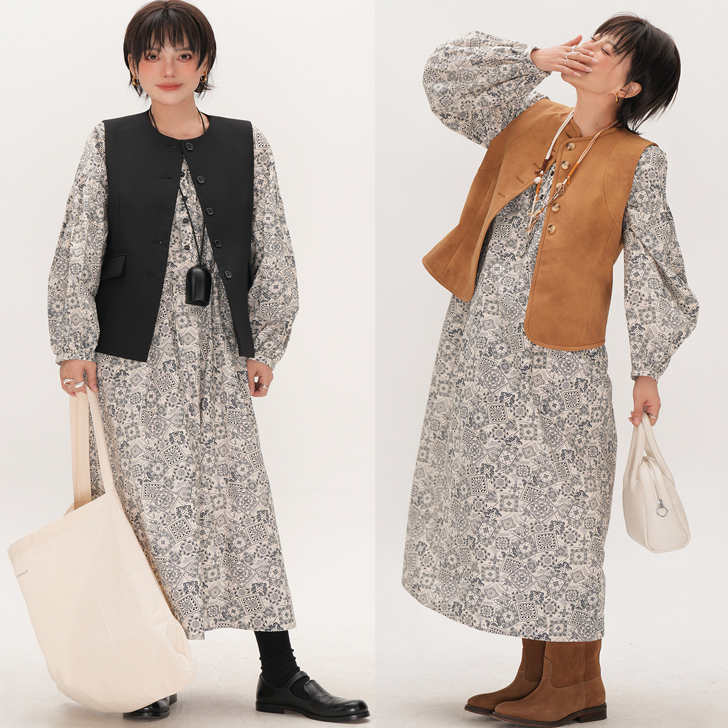 谭烟米 复古碎花连衣裙女宽松显瘦大码中长款长裙小众设计感长袖