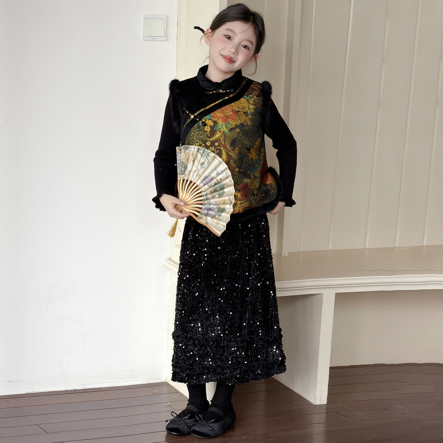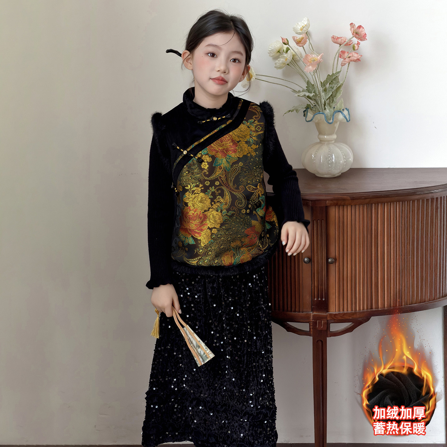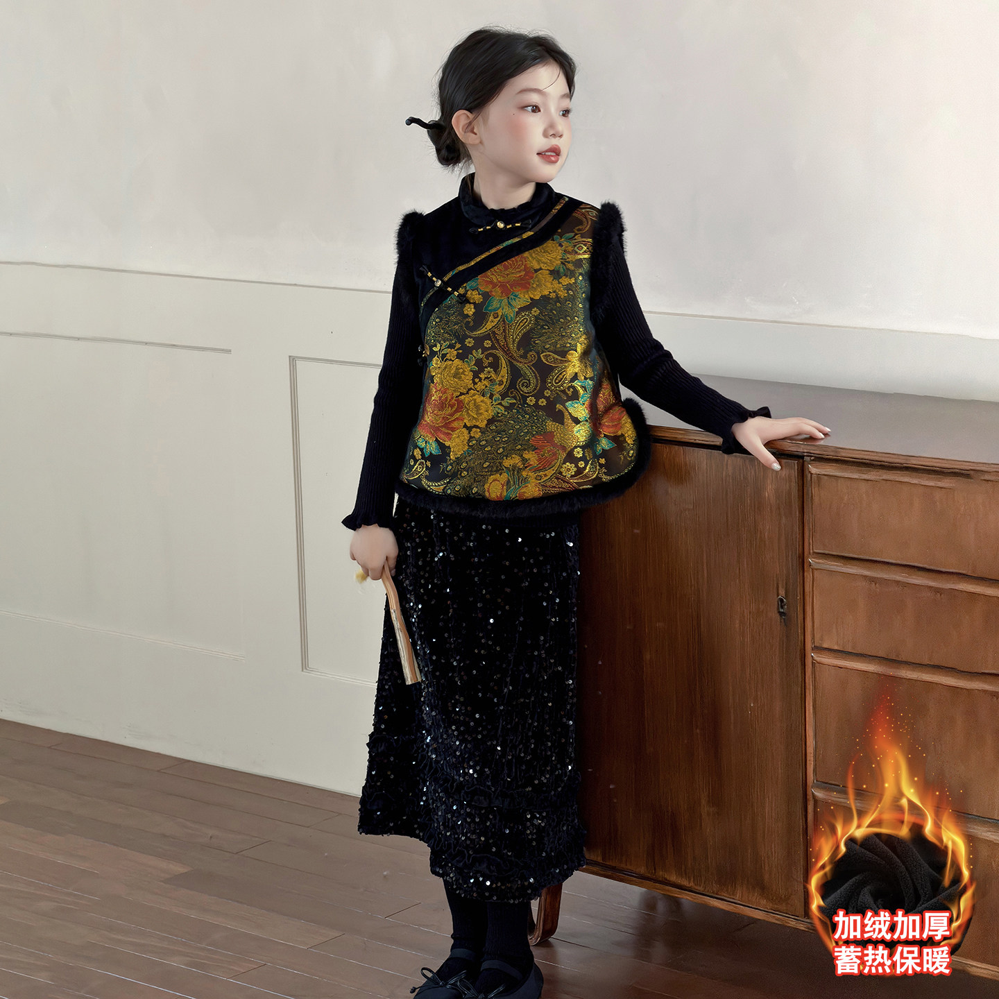 女童拜年服加绒2026新年战袍中式女孩中国风织金马甲过年服套装冬