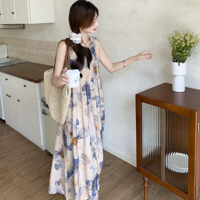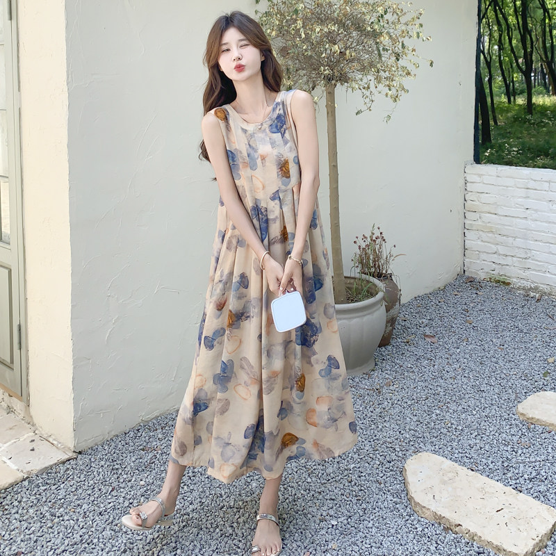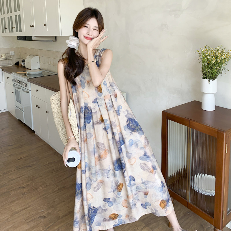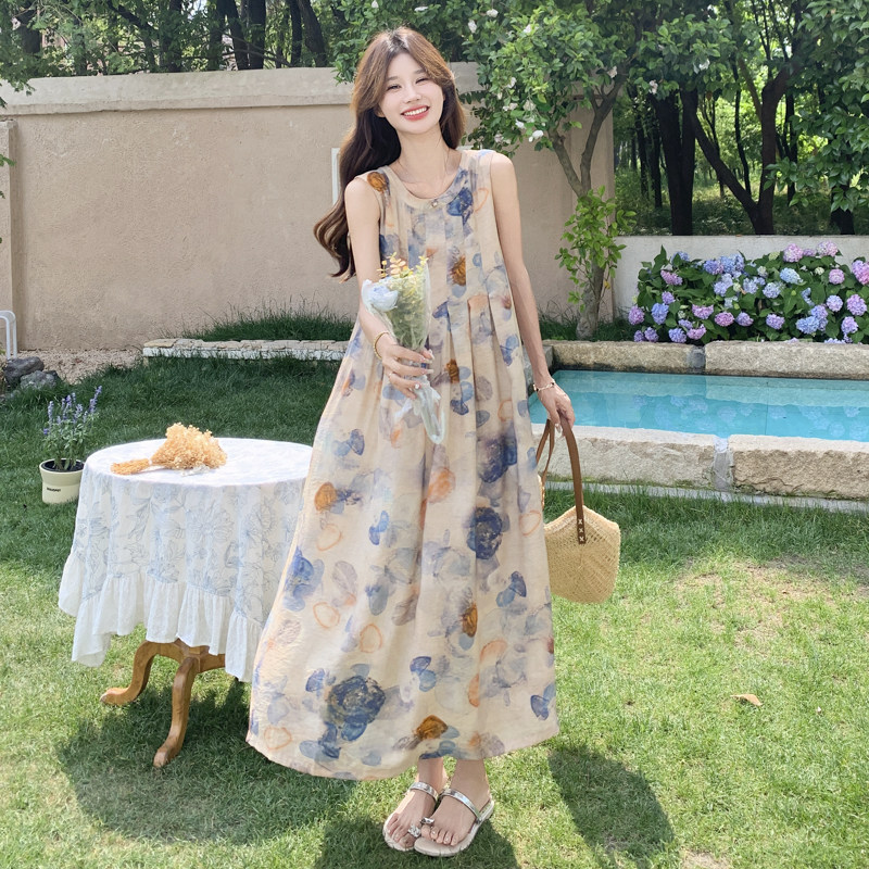 度假风印花大裙摆连衣裙 无袖长款休闲宽松夏季海边日常裙子女