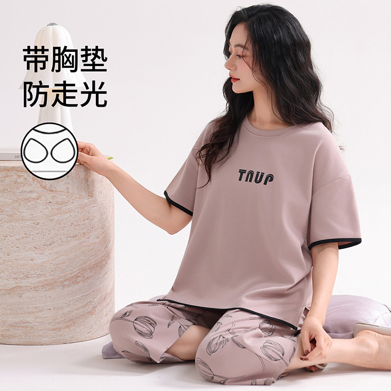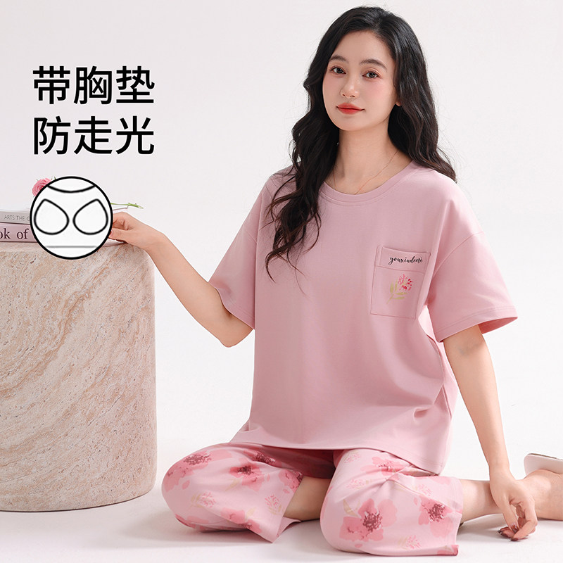 2026新款带胸垫睡衣女款夏纯棉短袖薄款七分裤夏季家居服大码套头