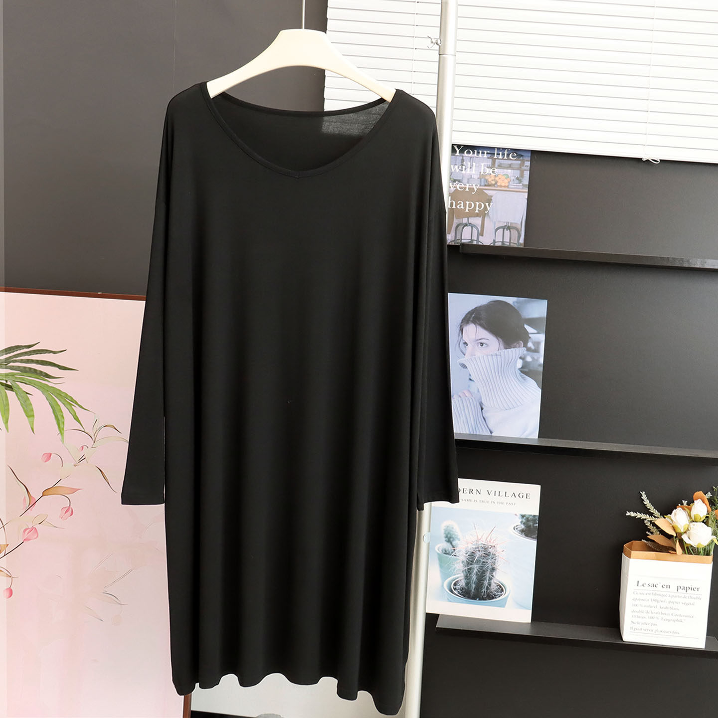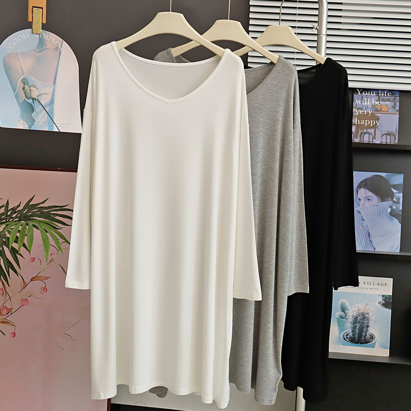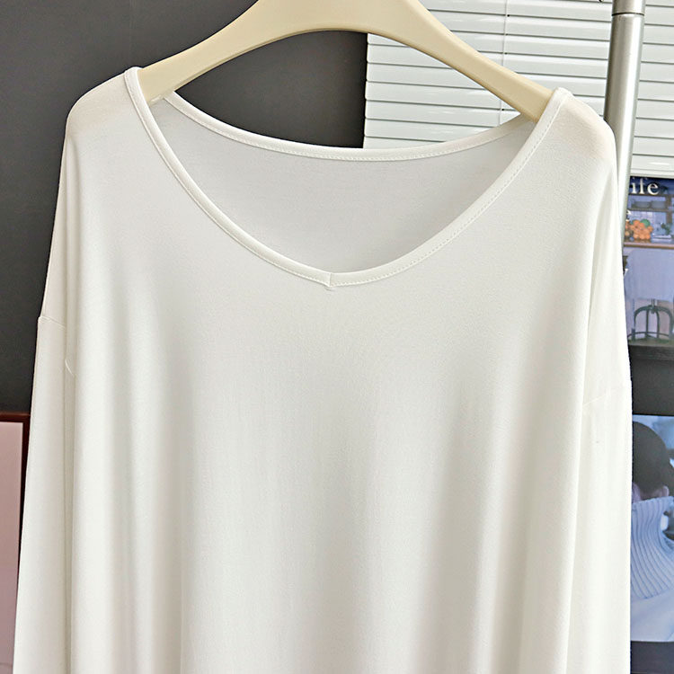 春秋季中长款莫代尔V领长袖T恤裙慵懒风宽松大码睡裙孕妇连衣裙薄
