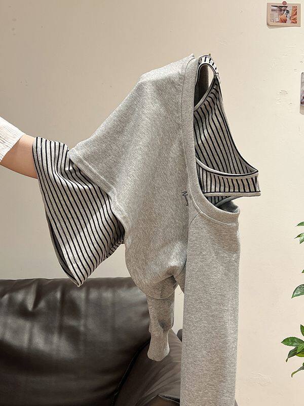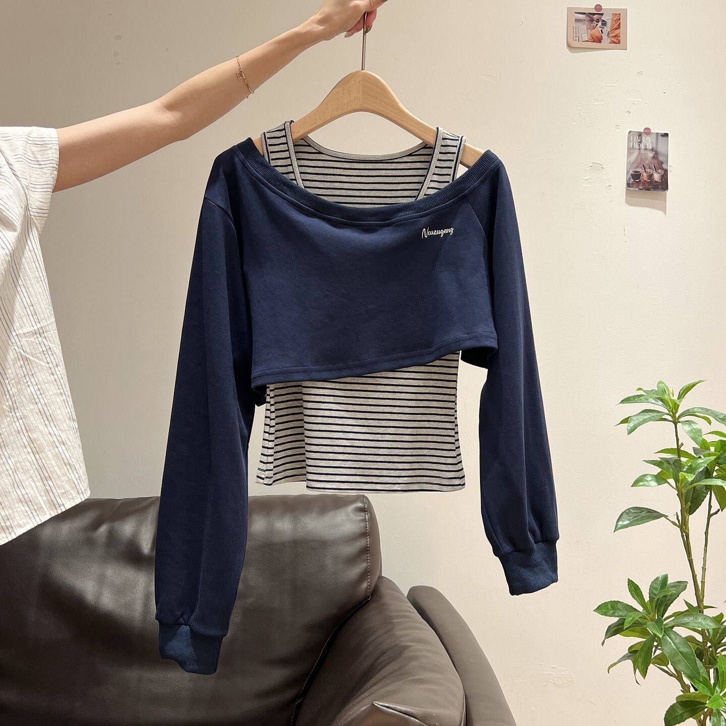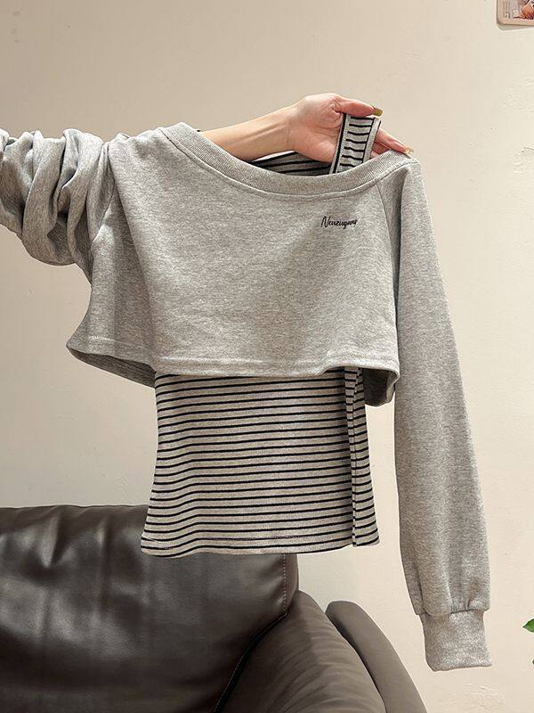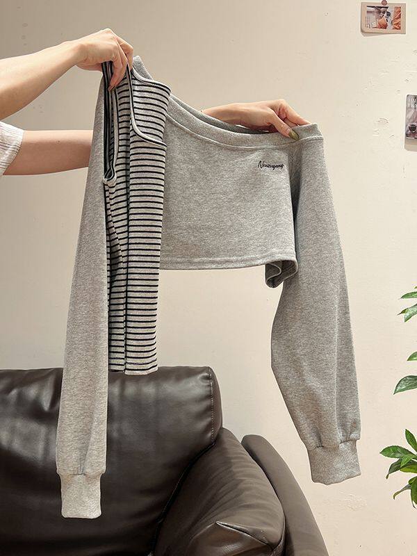 条纹拼接时尚套装女2026春款韩系短款长袖卫衣+半身裙休闲两件套