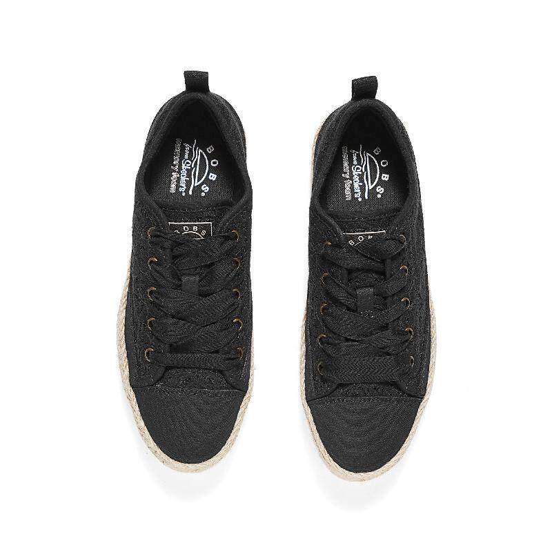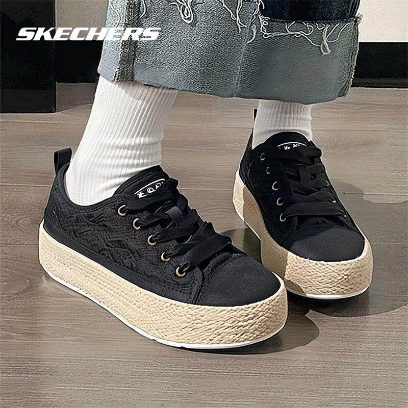 斯凯奇女鞋蕾丝帆布鞋夏季新款轻便板鞋透气软底休闲鞋黑色老人鞋