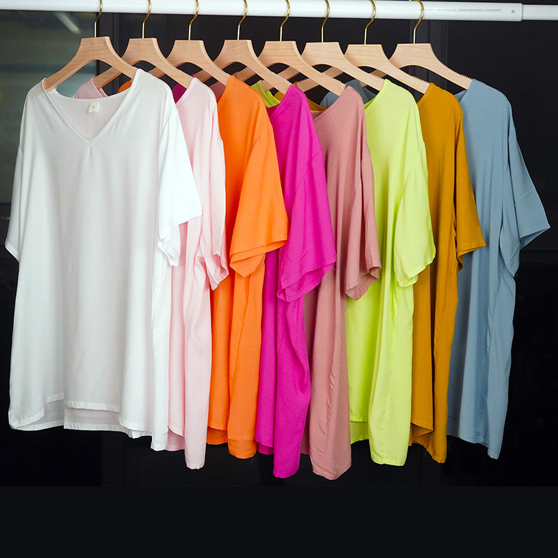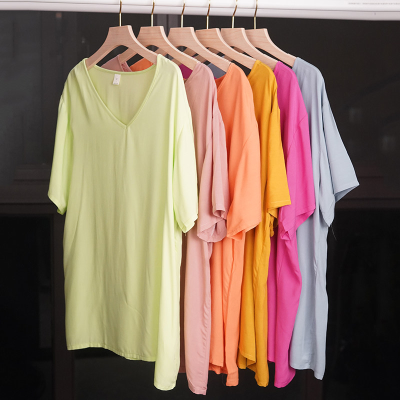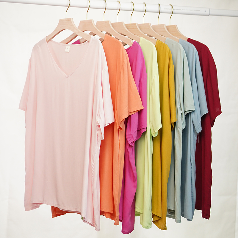 棉绸睡衣女士夏季T纯色简约短袖上衣t恤单件大码人造棉家居服女款