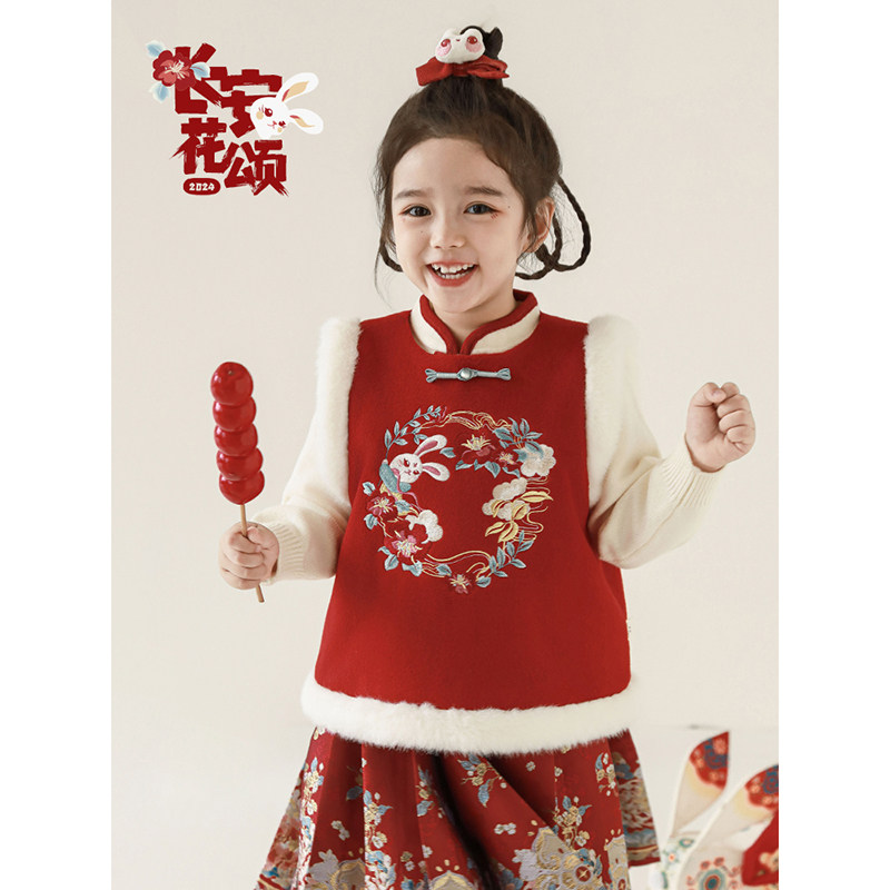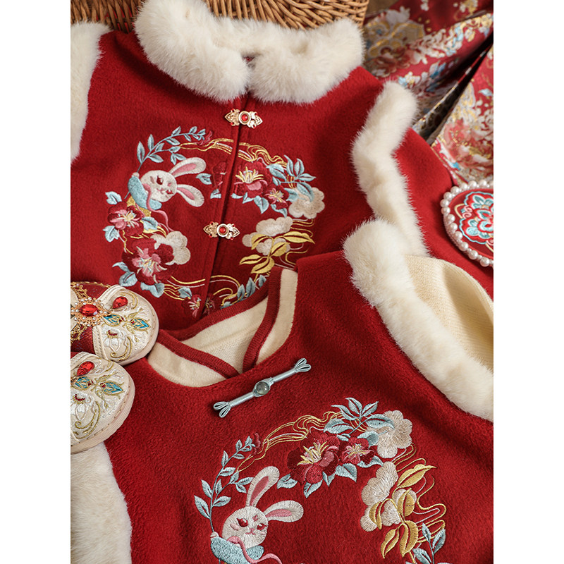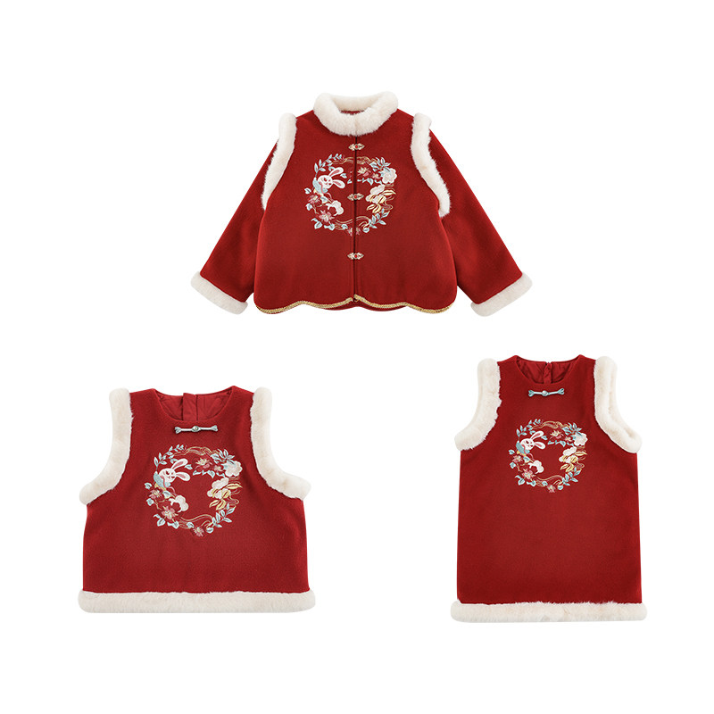 幼悠女童新中式过年服系列冬季甜美兔子花环刺绣外套连衣裙多件套