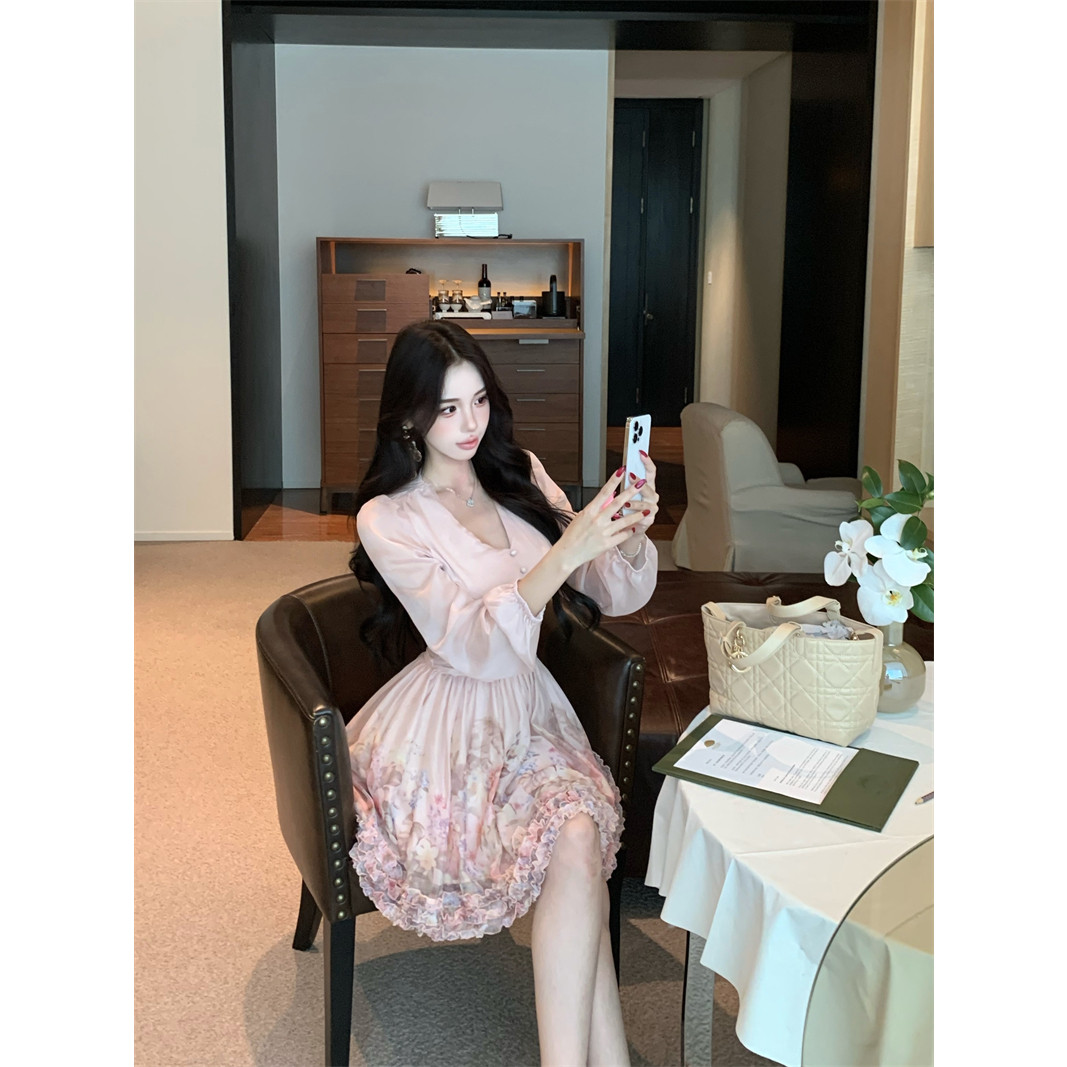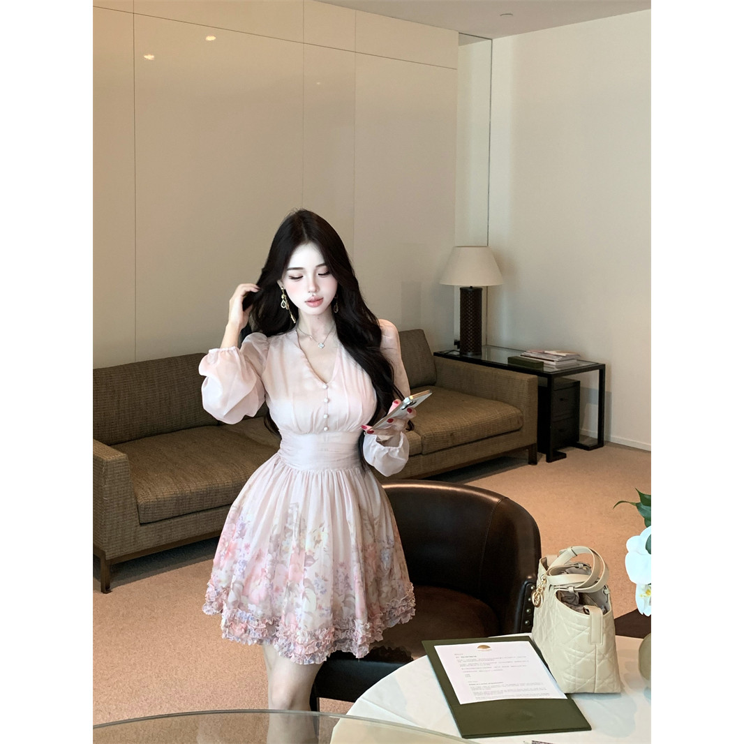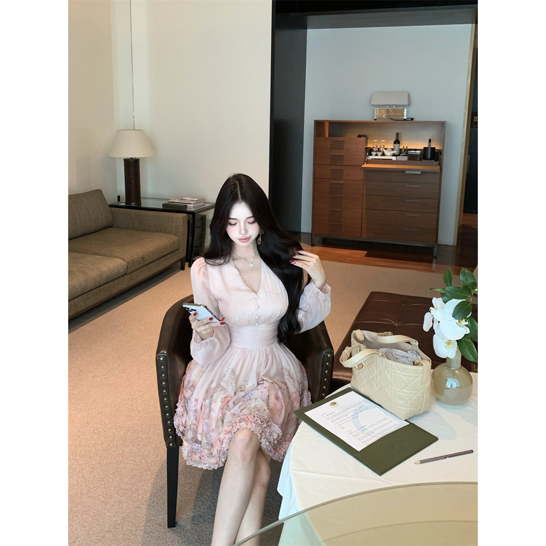 实拍实价法式V领粉色长袖连衣裙女收腰气质名媛小个子法式印花裙
