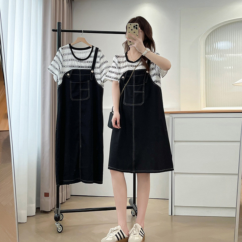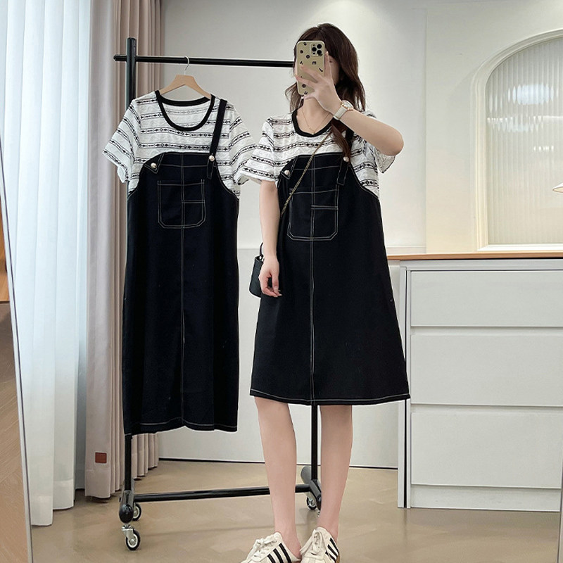 大码蕾丝拼接连衣裙女夏季巨显瘦胖mm200斤遮肚子a字假两件背带裙