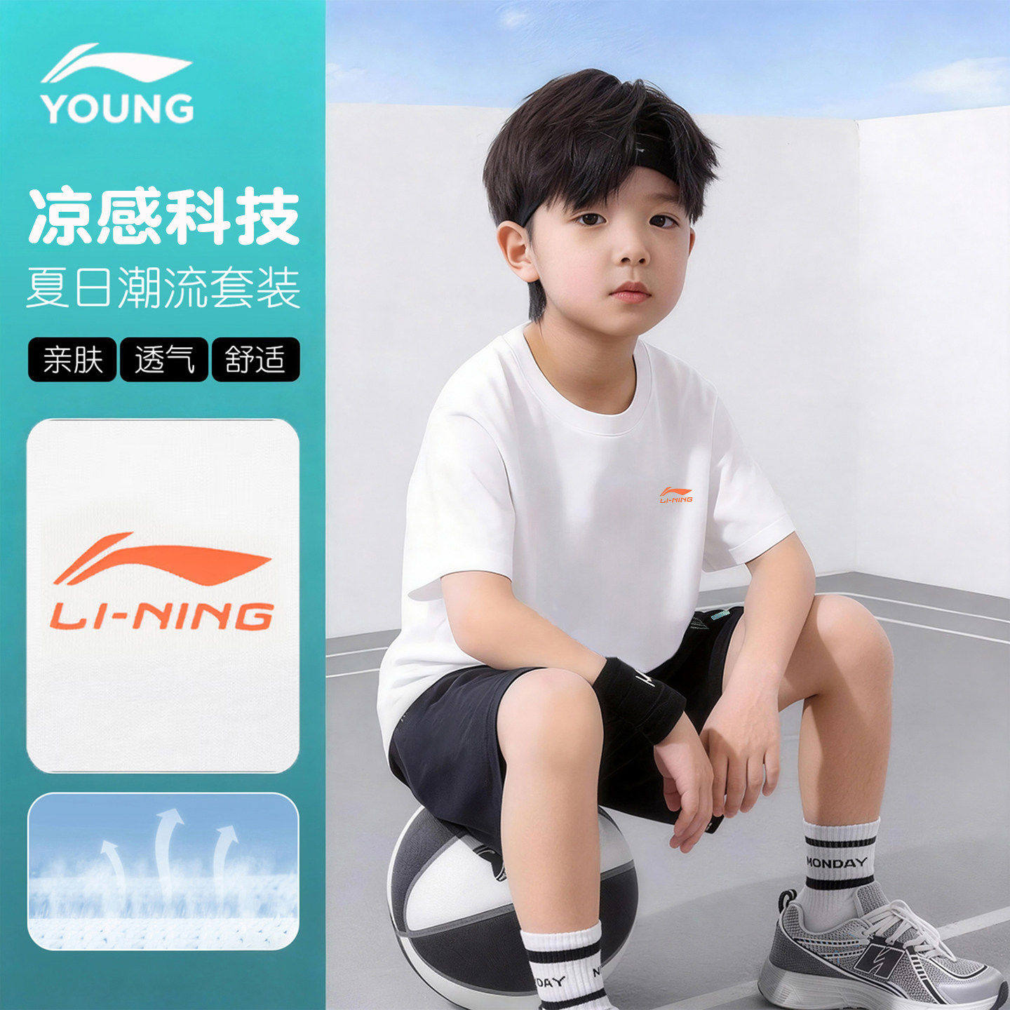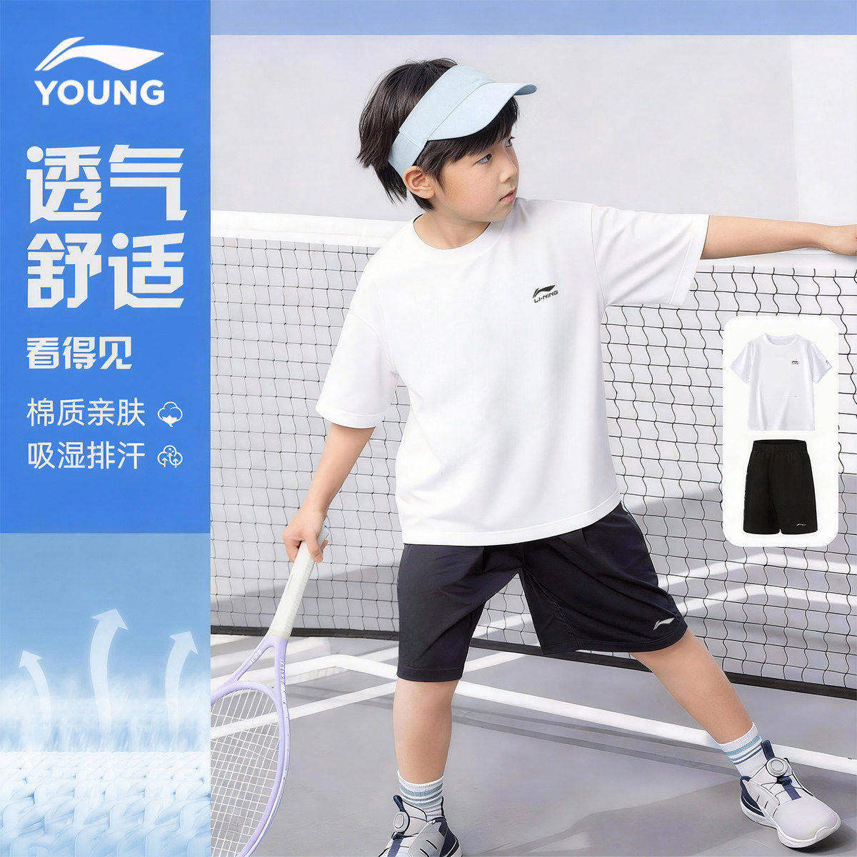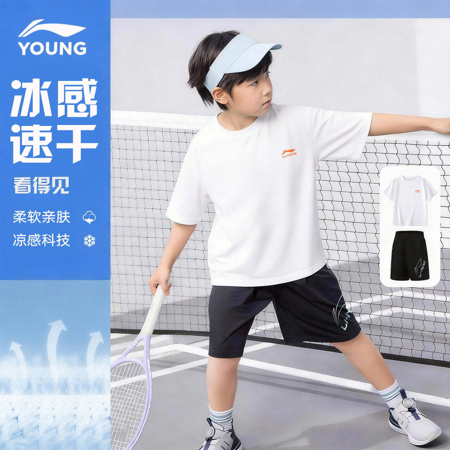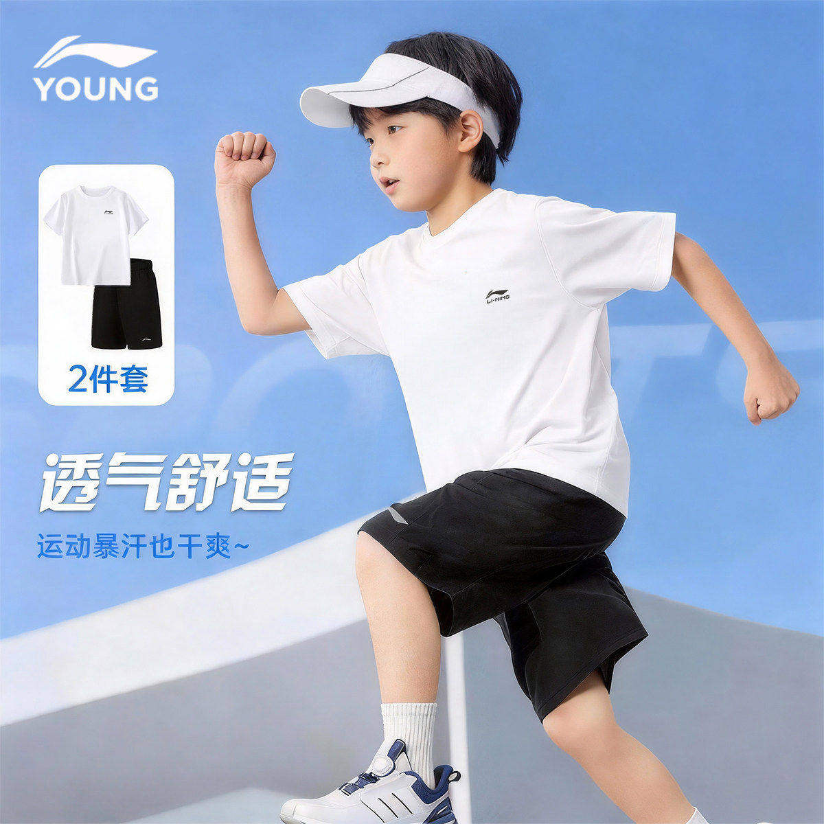 李宁男童速干短袖t恤套装儿童青少年纯棉速干短裤两件套夏装新款