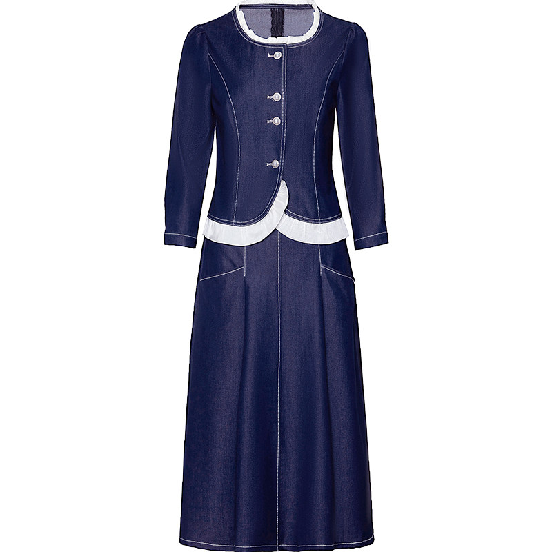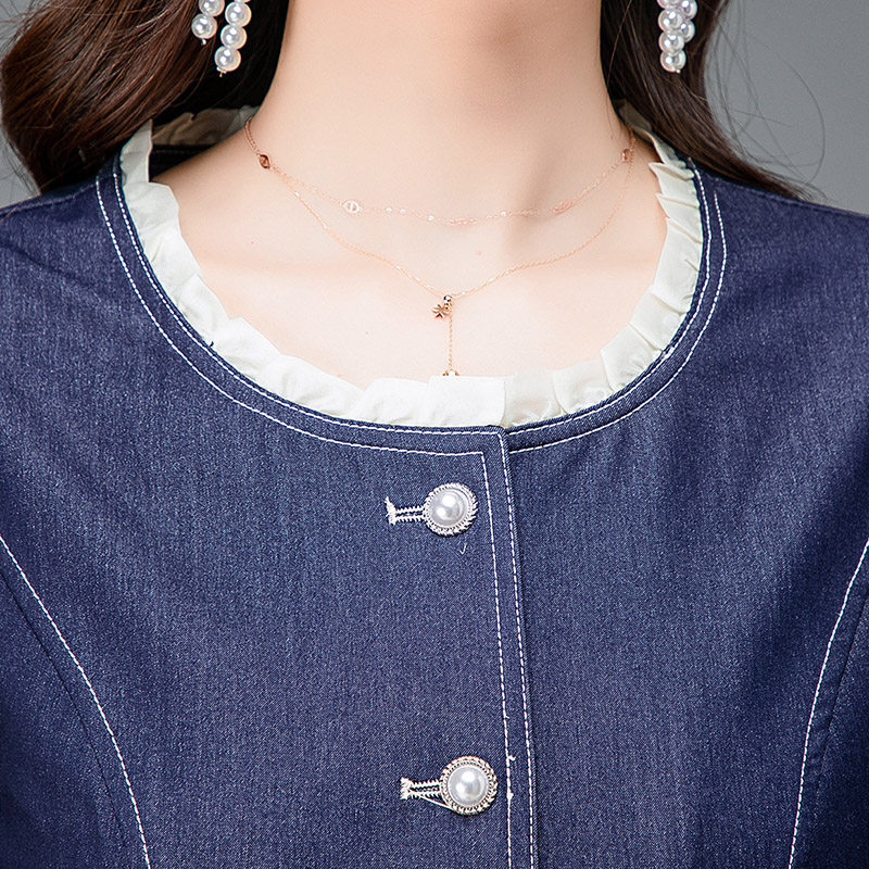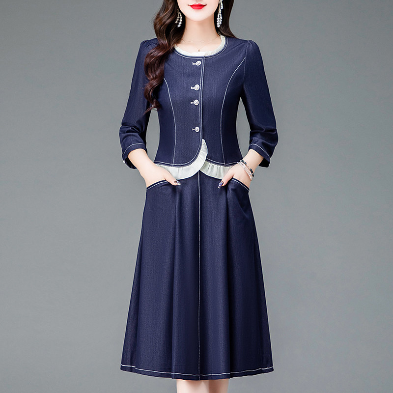 春秋季女士新款牛仔两件套长袖收腰修身气质显瘦小个子圆领连衣裙