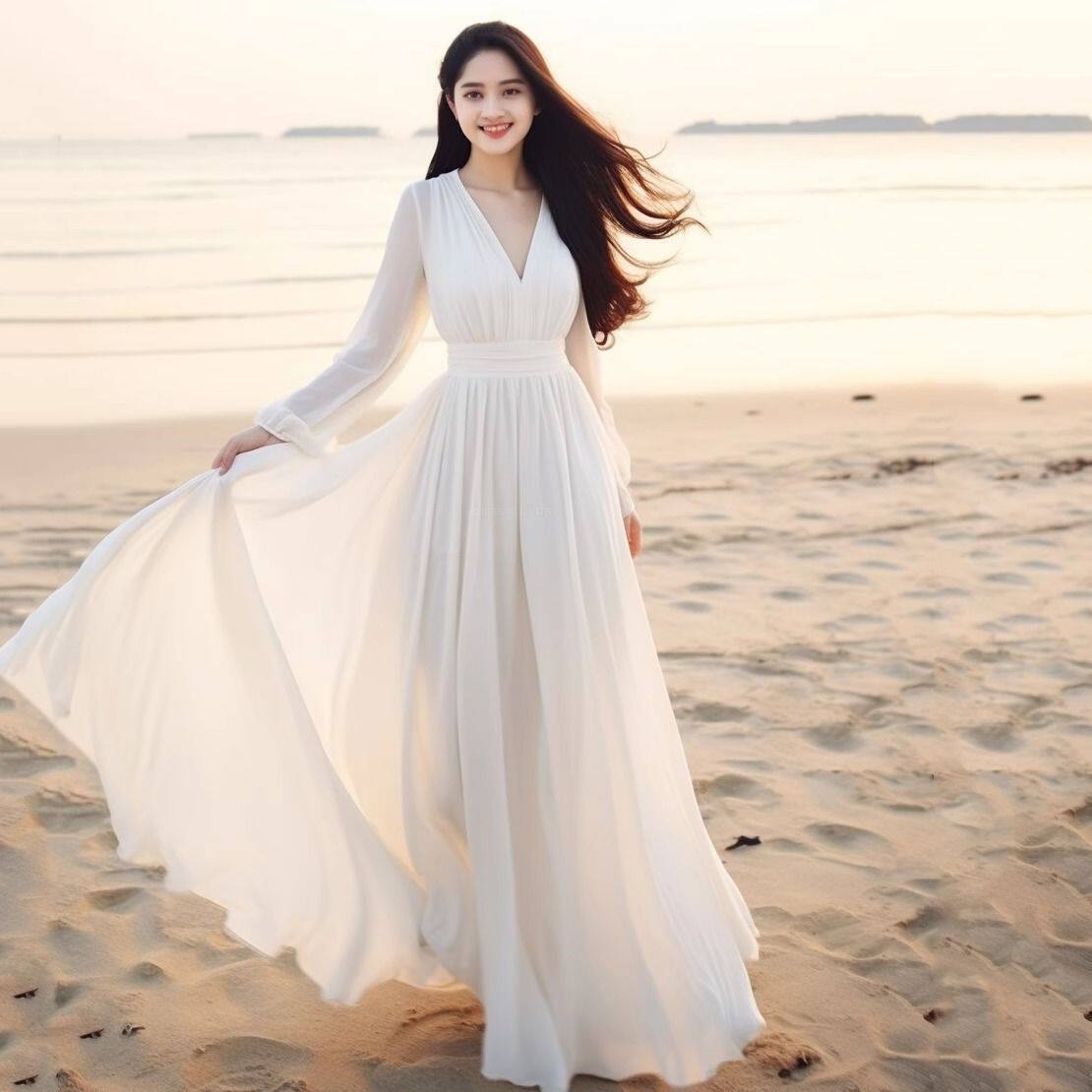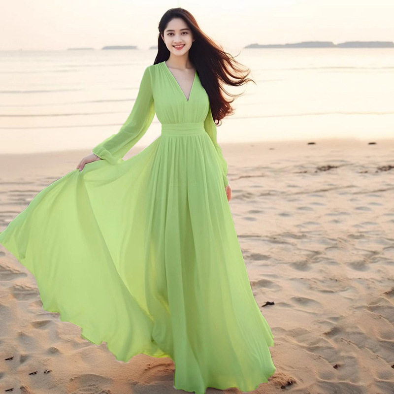 春夏新款长袖V领雪纺连衣裙女高腰显瘦气质大摆旅游度假沙滩长裙