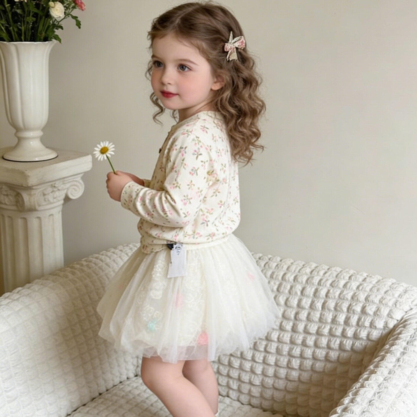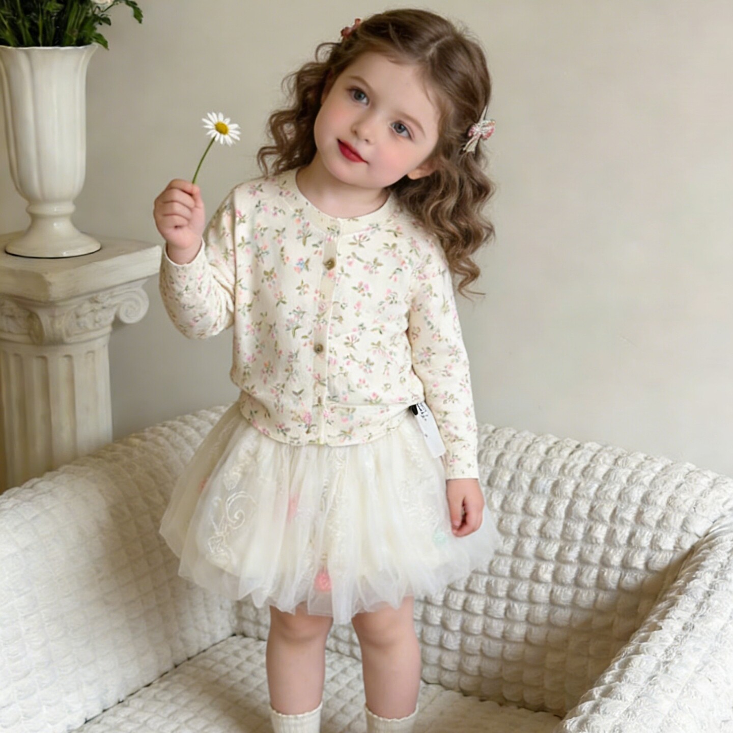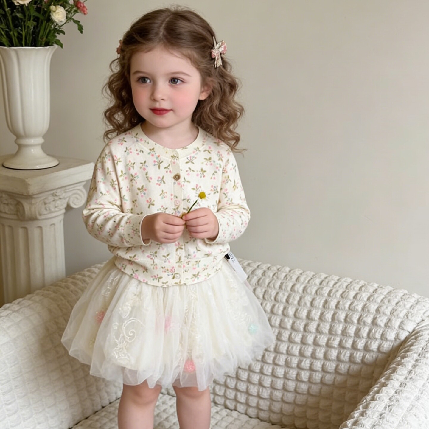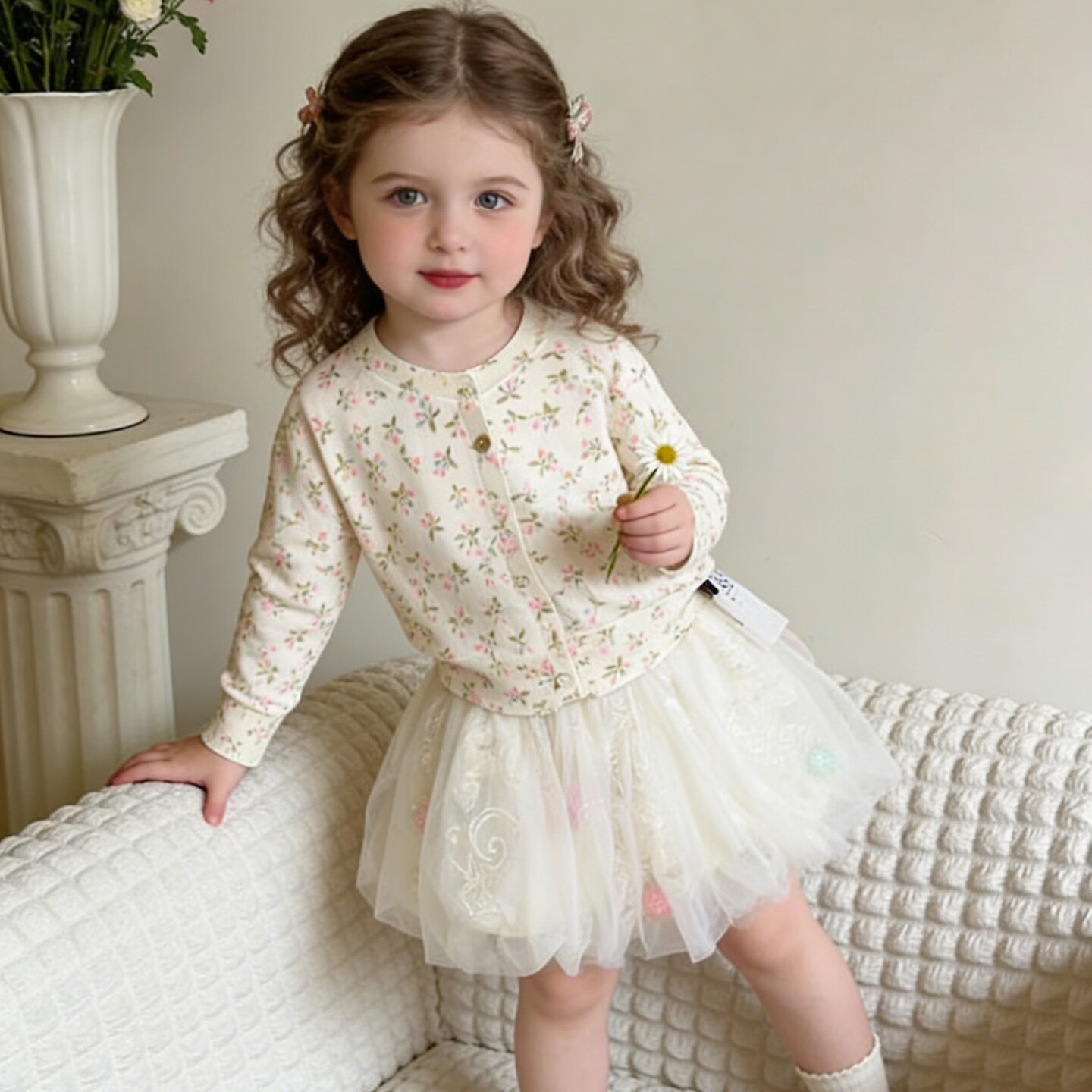 女童套装春季洋气时尚女宝宝碎花开衫网纱半身裙儿童生日礼服春装