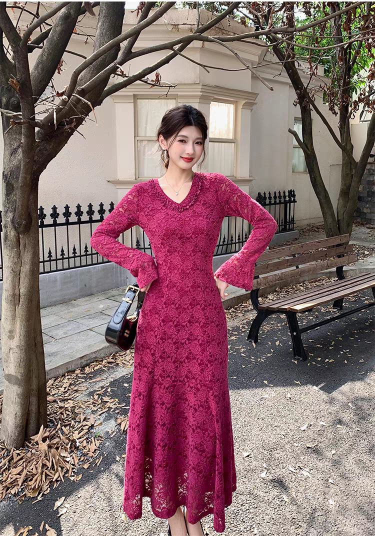 上新法式浪漫鱼尾蕾丝连衣裙长袖V领收腰修身气质