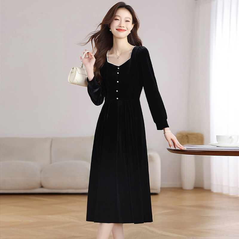实拍法式赫本风长袖连衣裙女秋季新款收腰显瘦气质丝绒黑色长裙