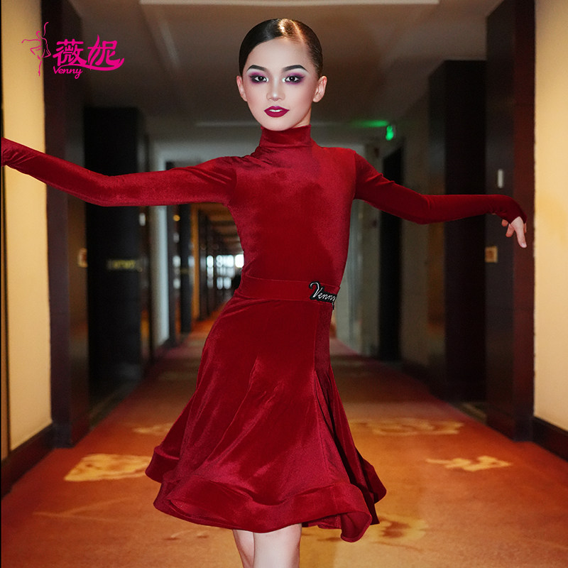 薇妮新款红色丝绒拉丁舞比赛服专业国标黑池规定服秋冬摩登舞蹈服