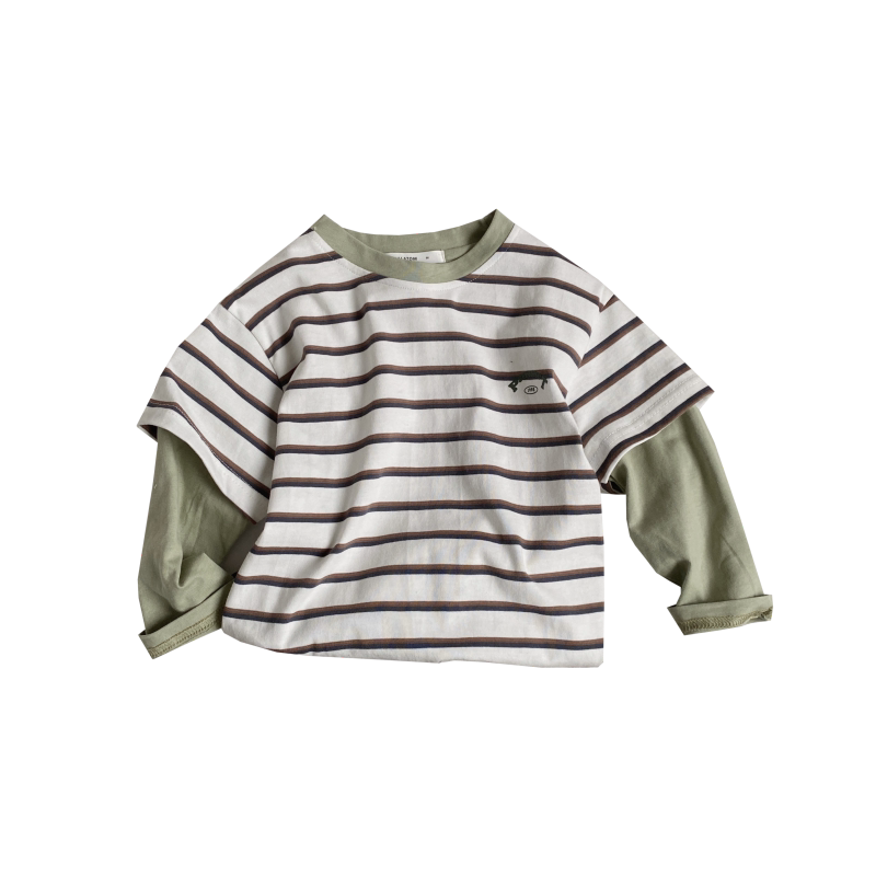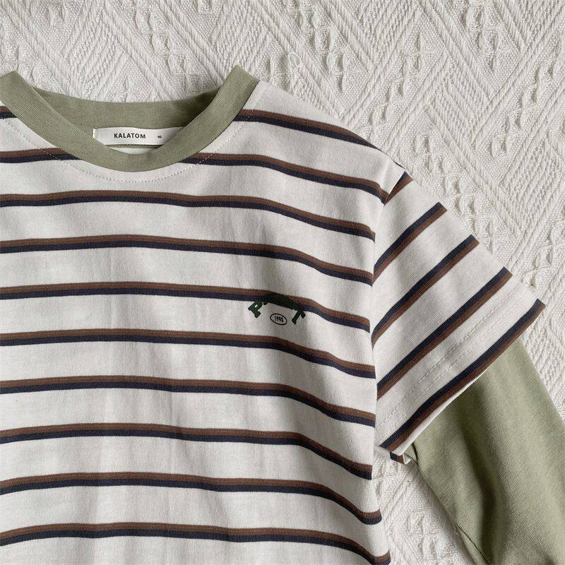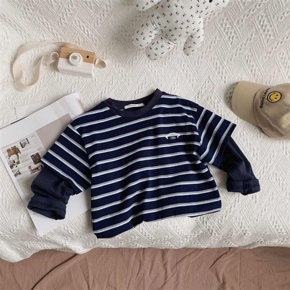 男童条纹T恤假两件纯棉春秋潮宽松韩版洋气长袖宝宝儿童打底衫男