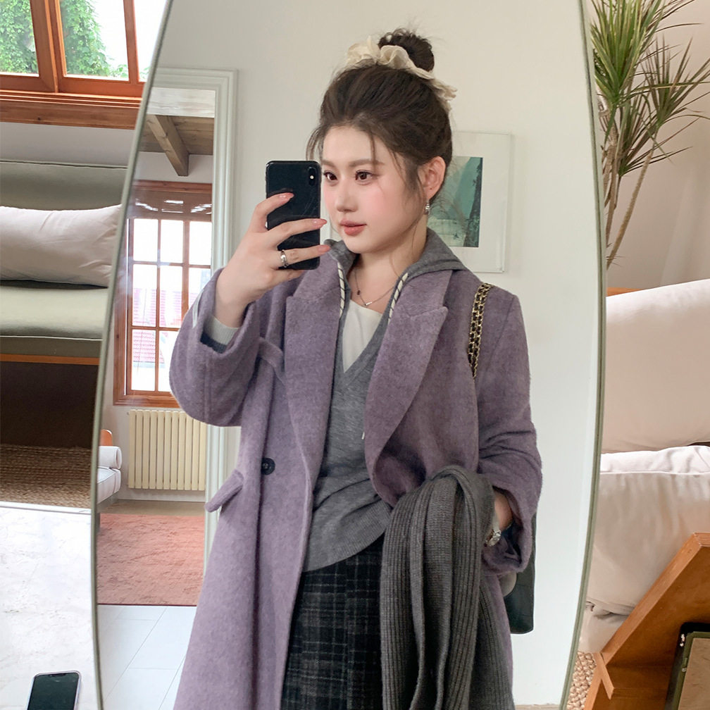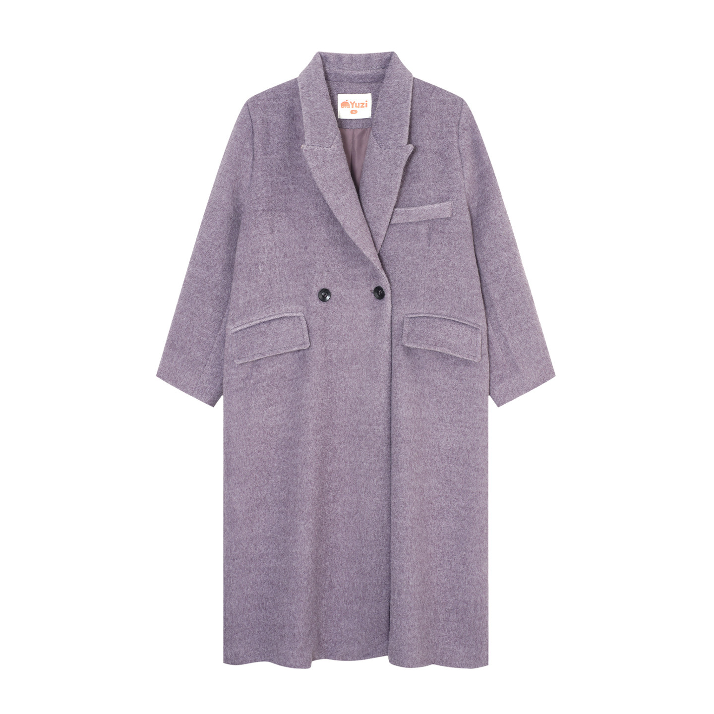 YUZI鱼子长款廓形毛呢大衣特大码女装淡紫色温柔加厚外套春季胖mm