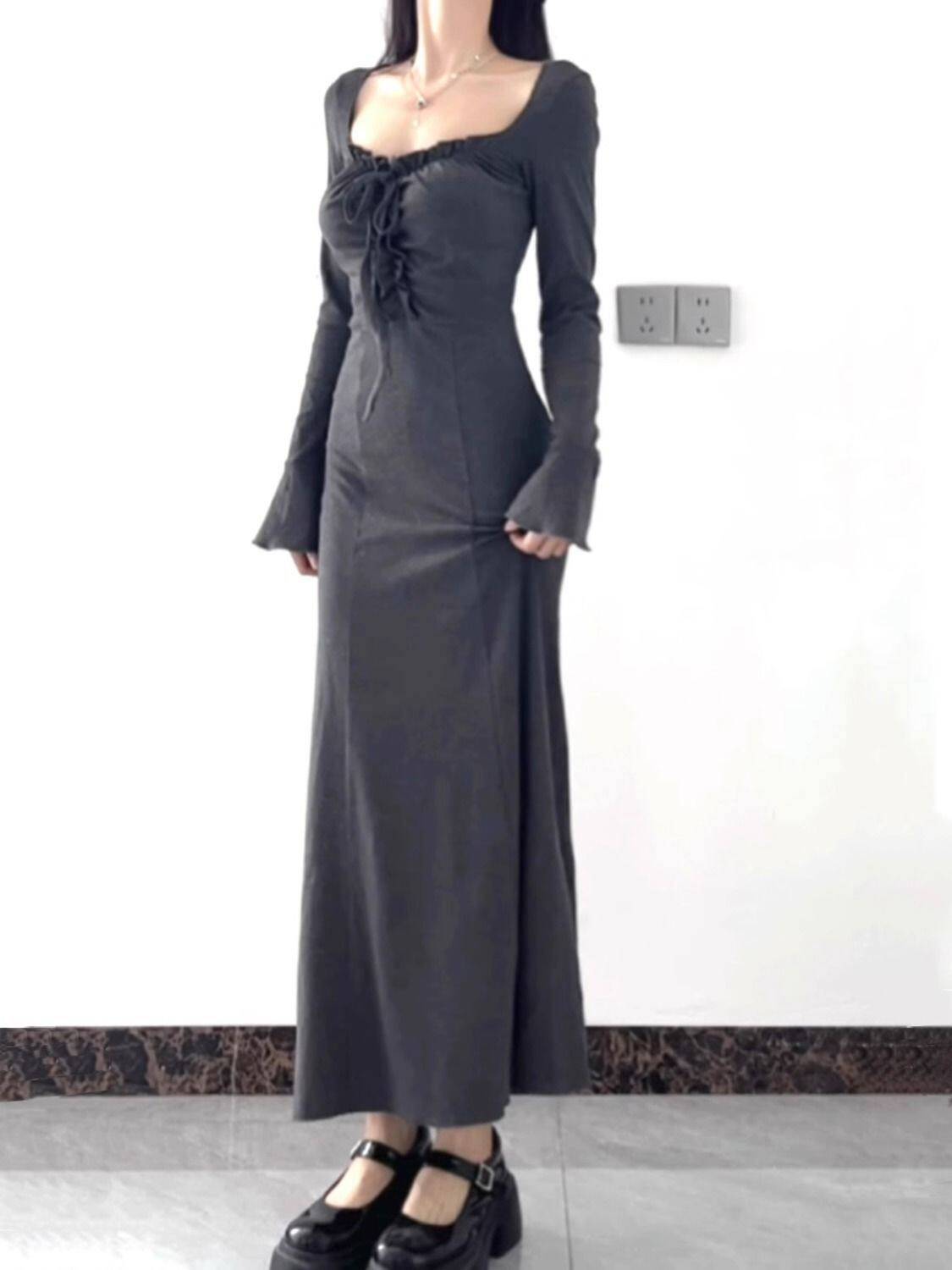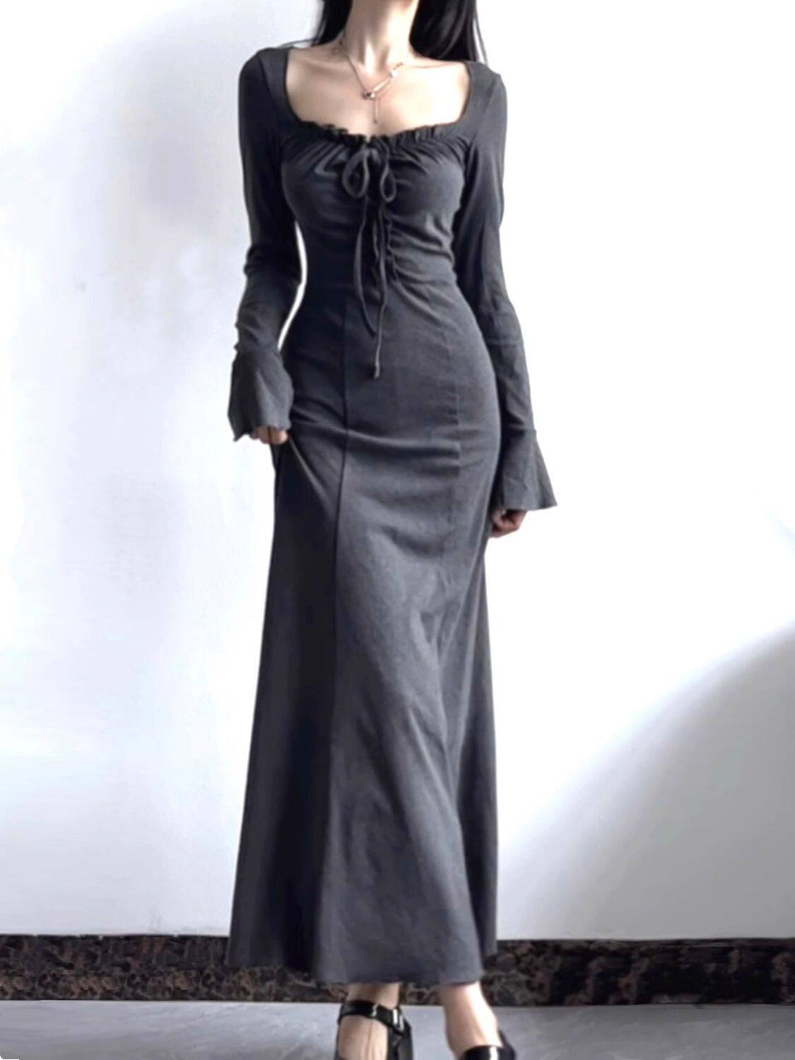 灰色长袖连衣裙女装早春小妈感紧身鱼尾裙子方领修身中长款包臀裙