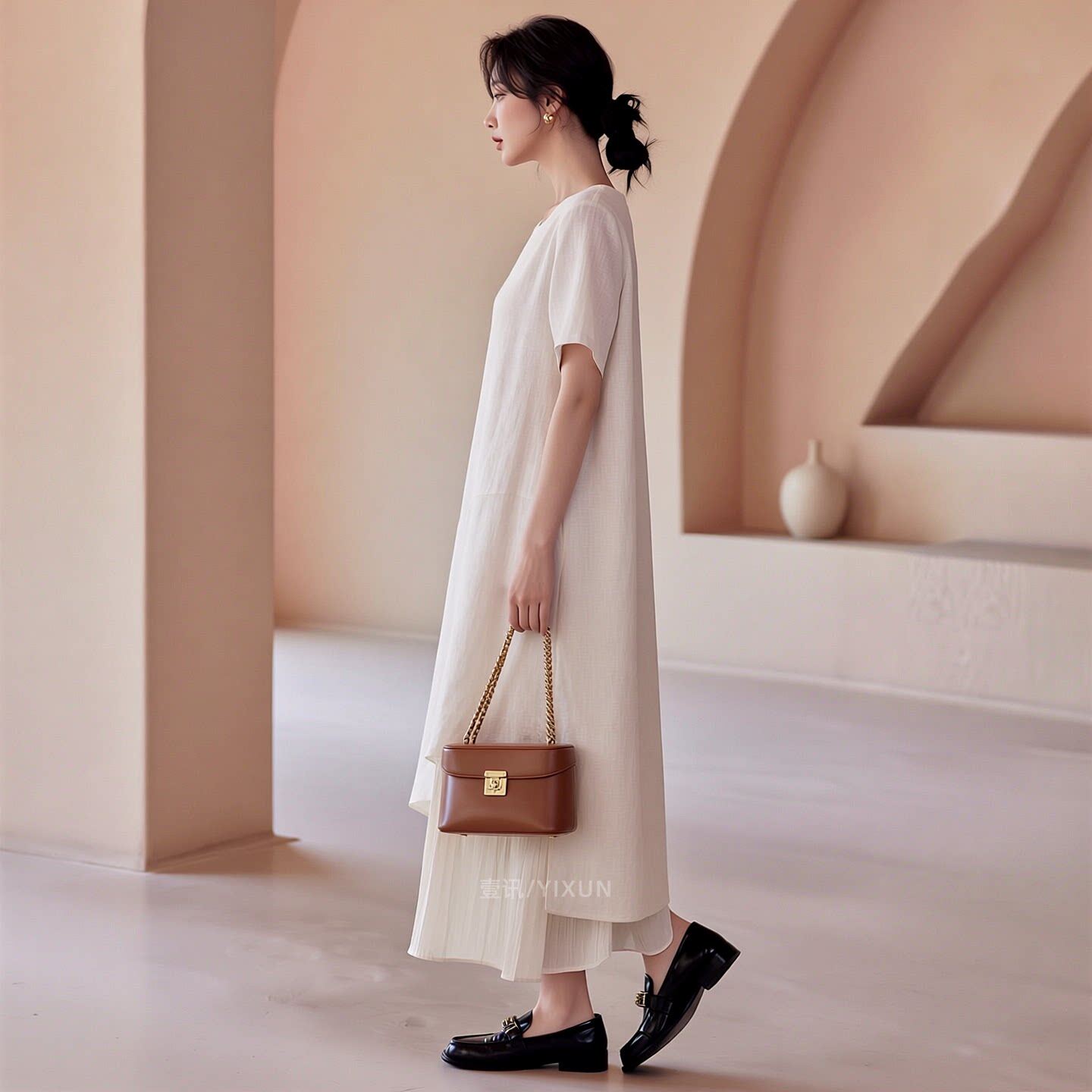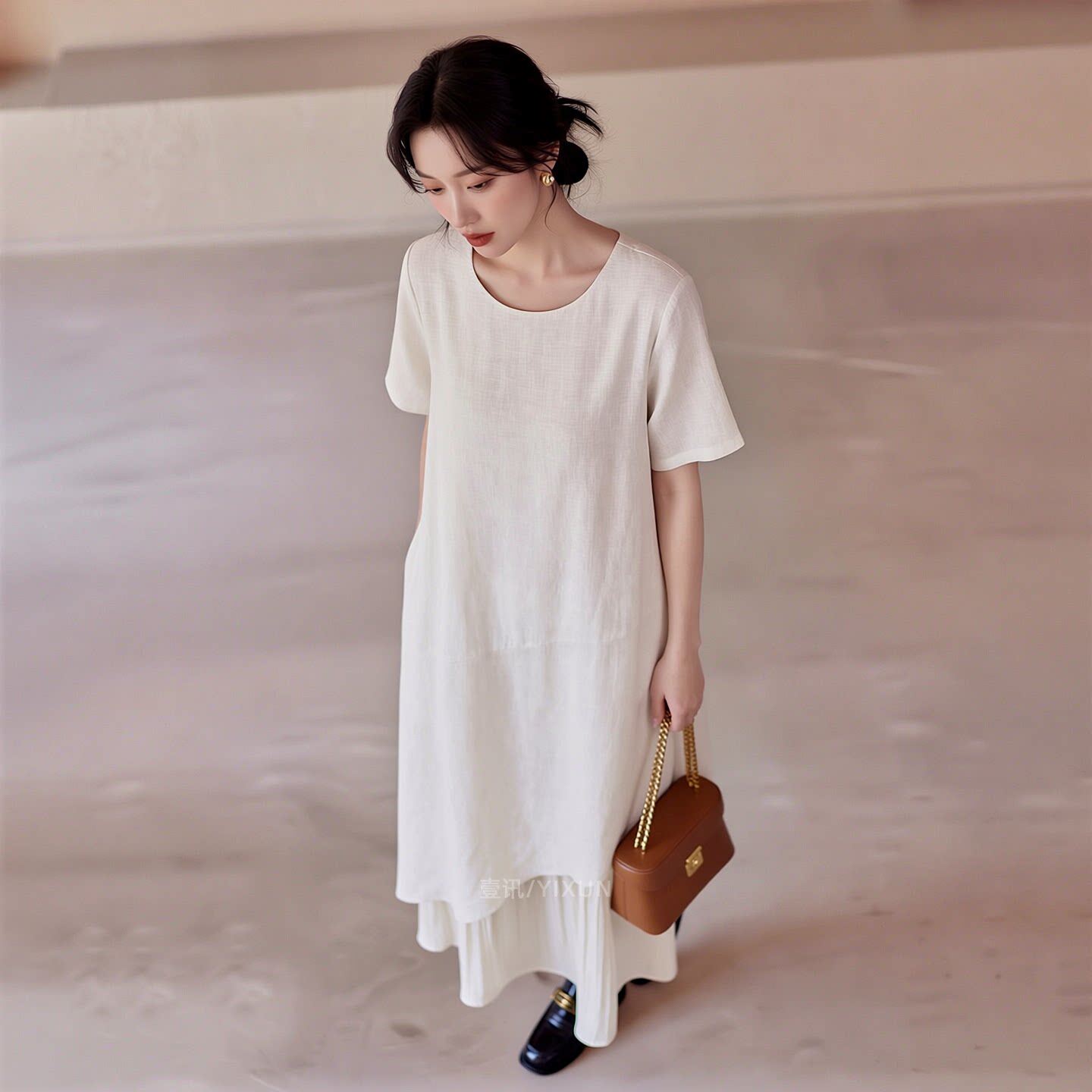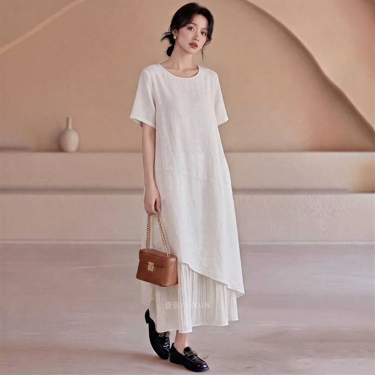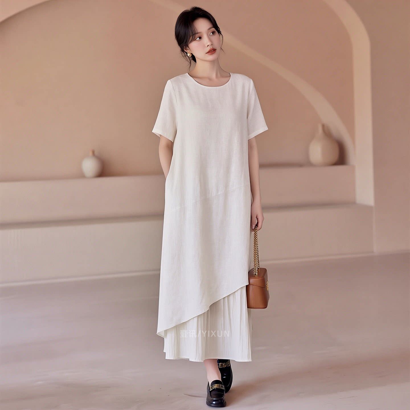 白色连衣裙女春夏新款简约风高级感大码短袖拼接设计感宽松显瘦裙