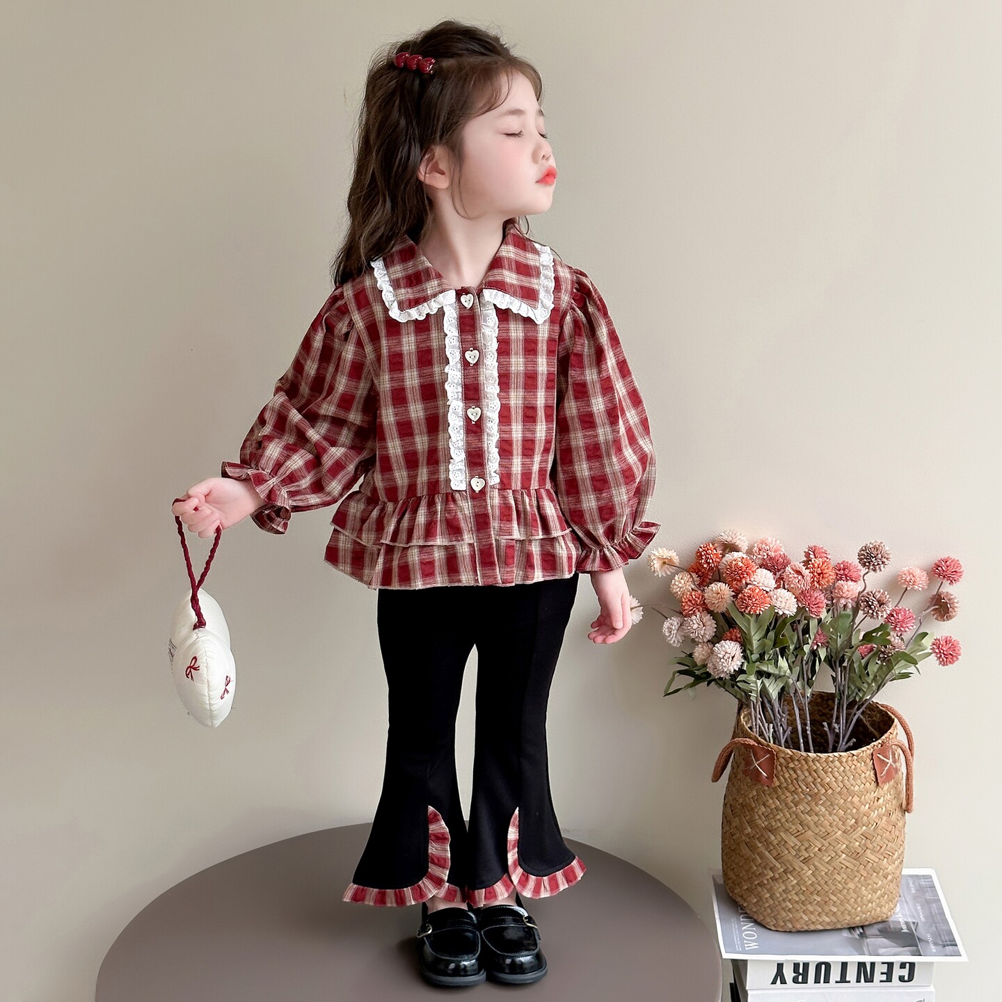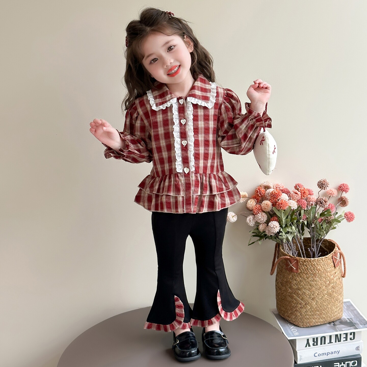 311线报网描述:女童长袖格子衬衫喇叭裤搭配,炸街时髦春秋