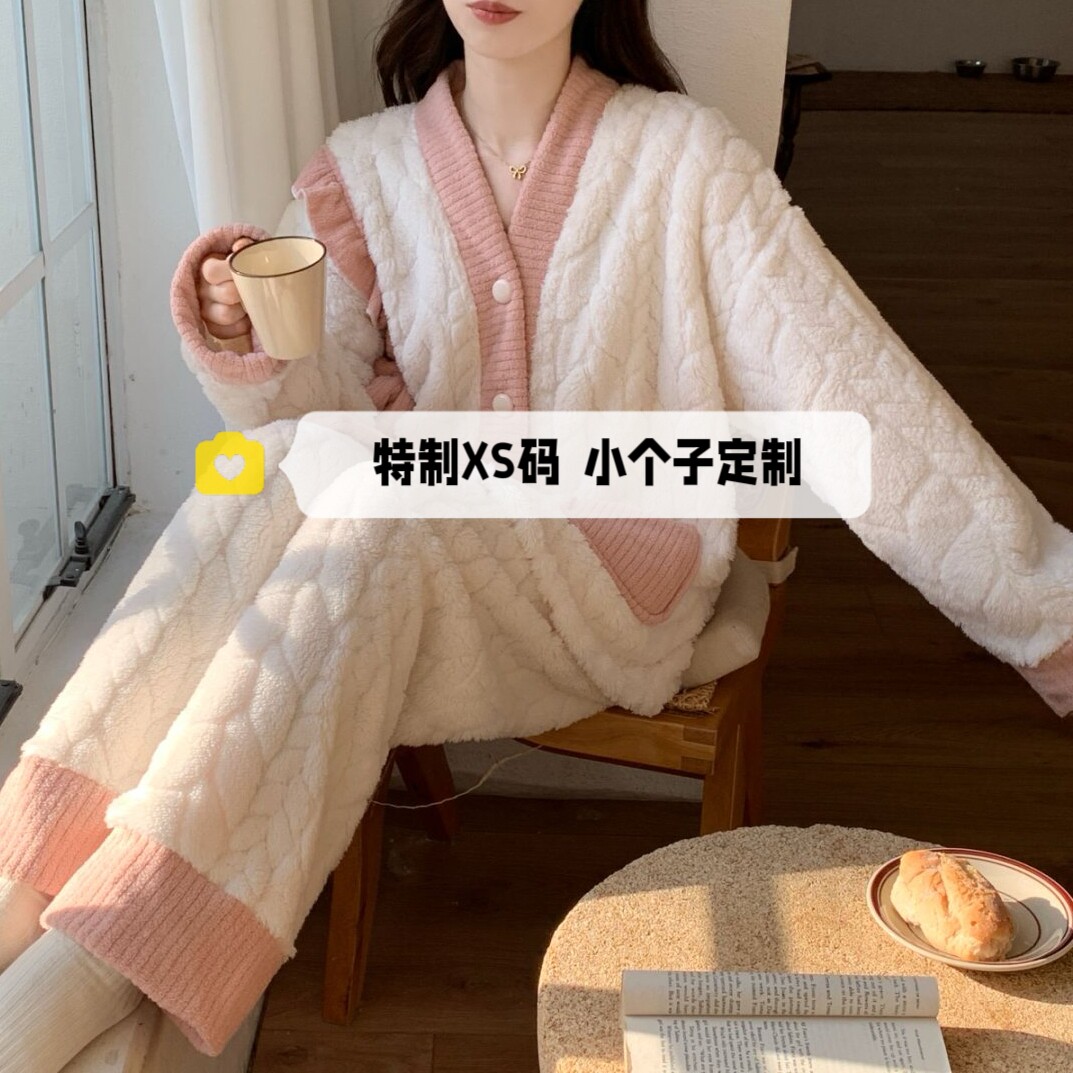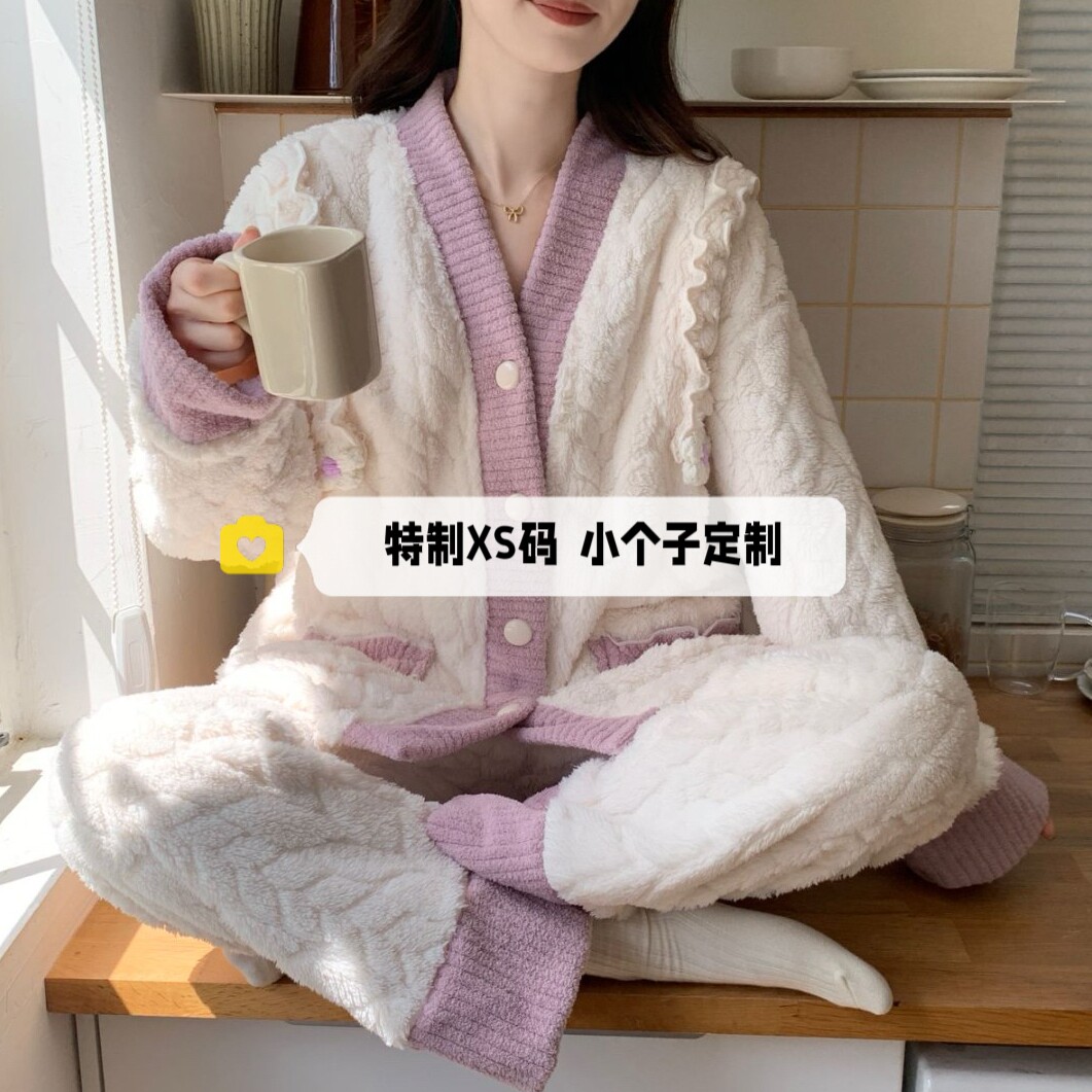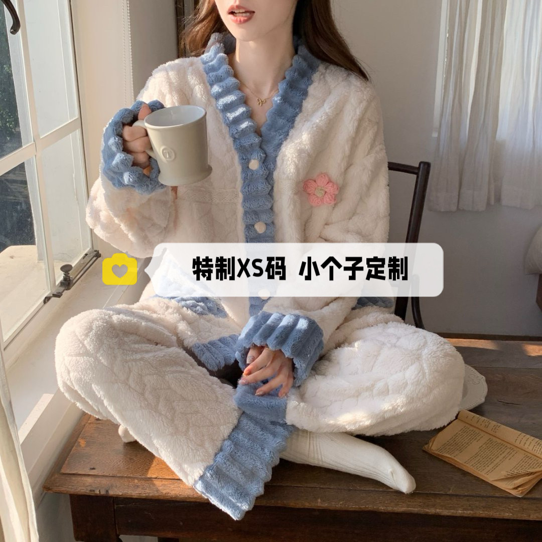 150cm小个子珊瑚绒睡衣女冬季加绒加厚保暖法兰绒长袖家居服套装