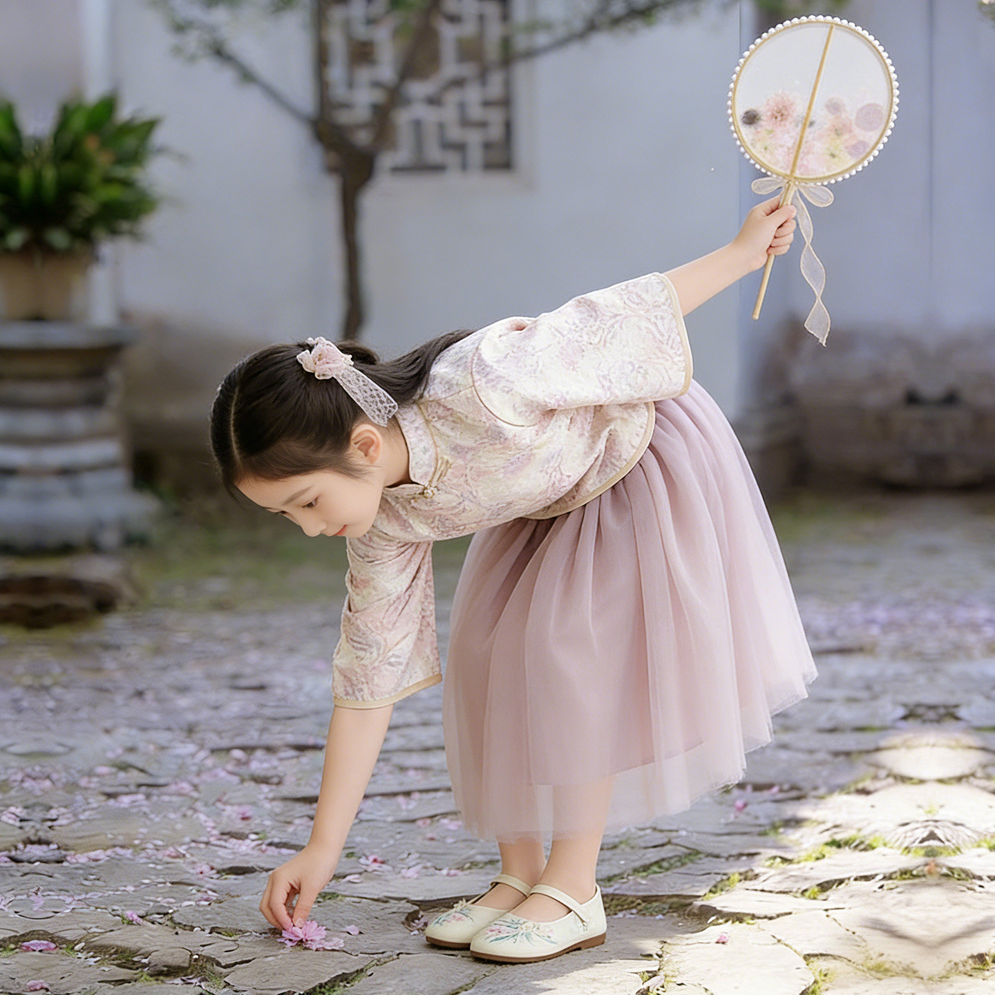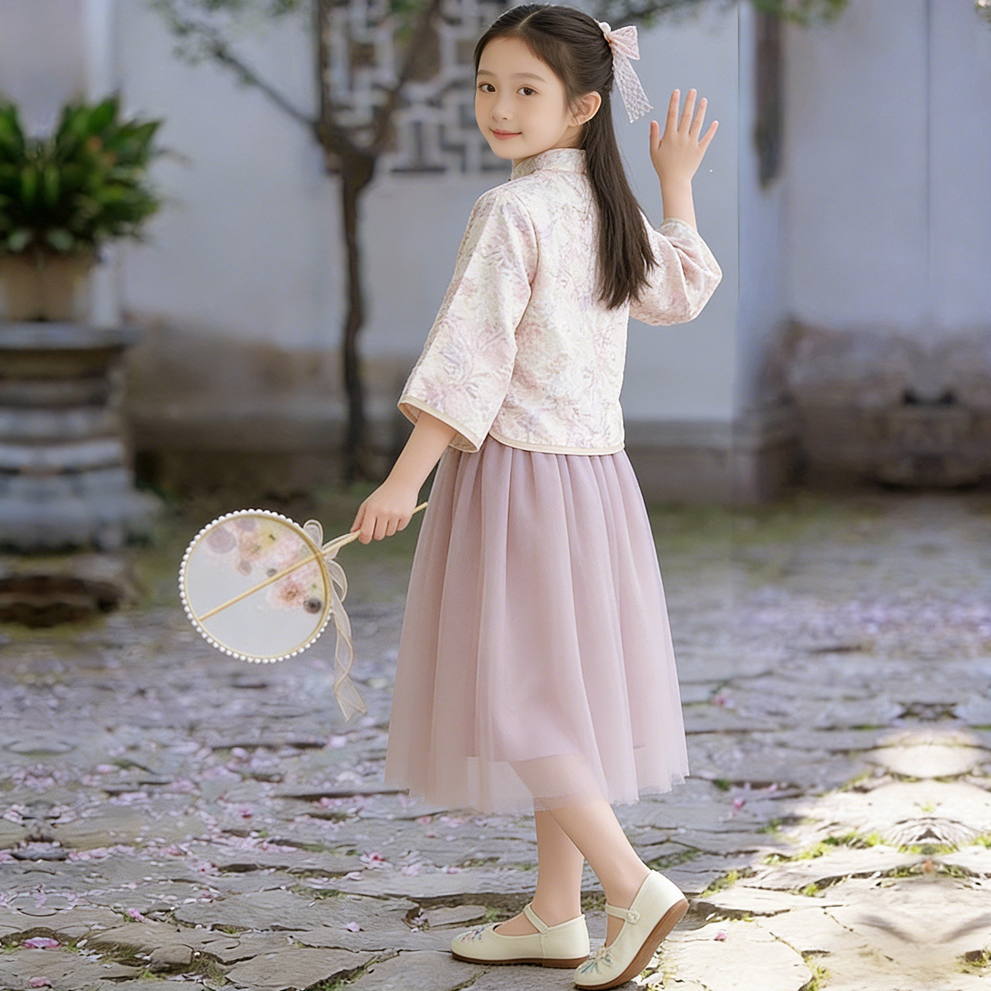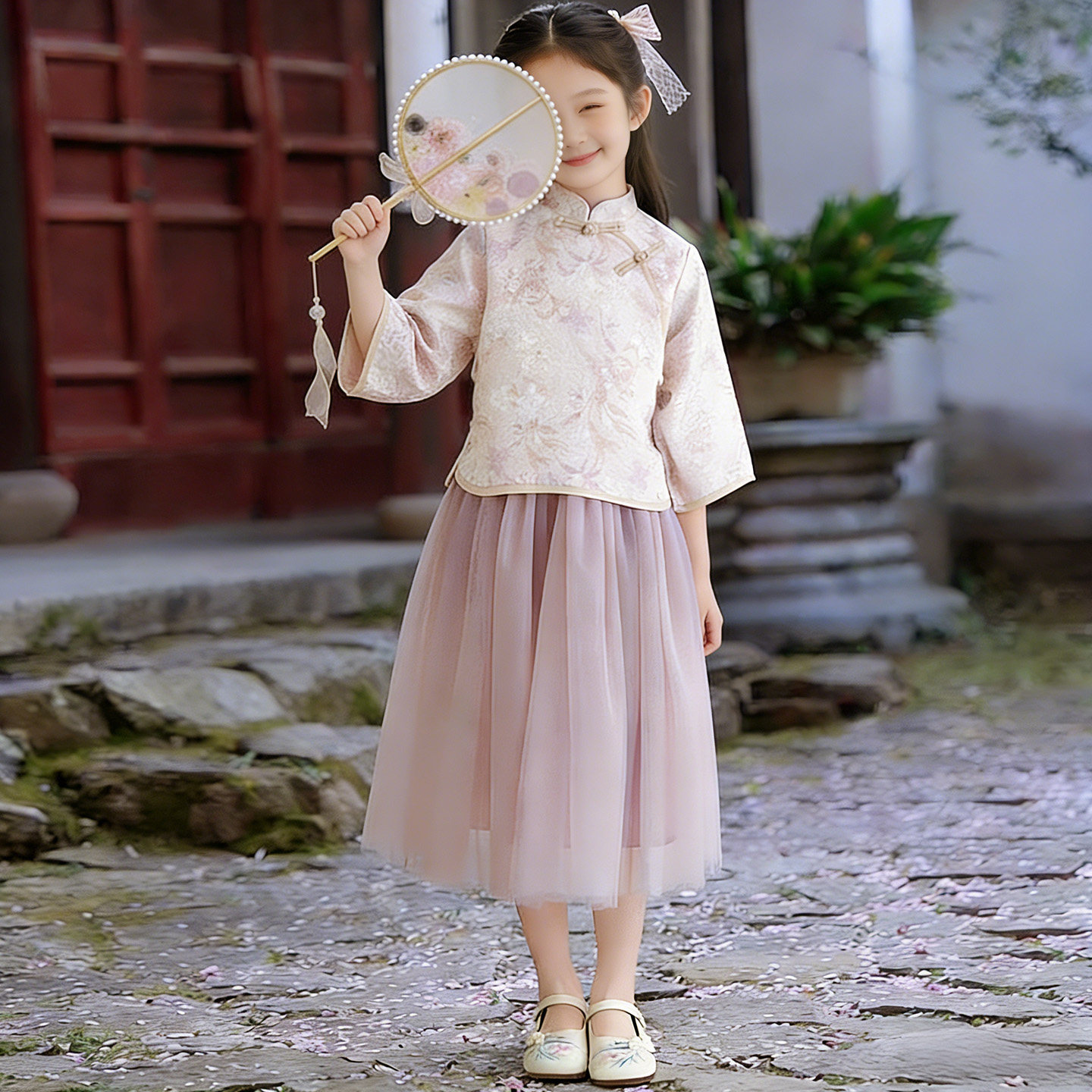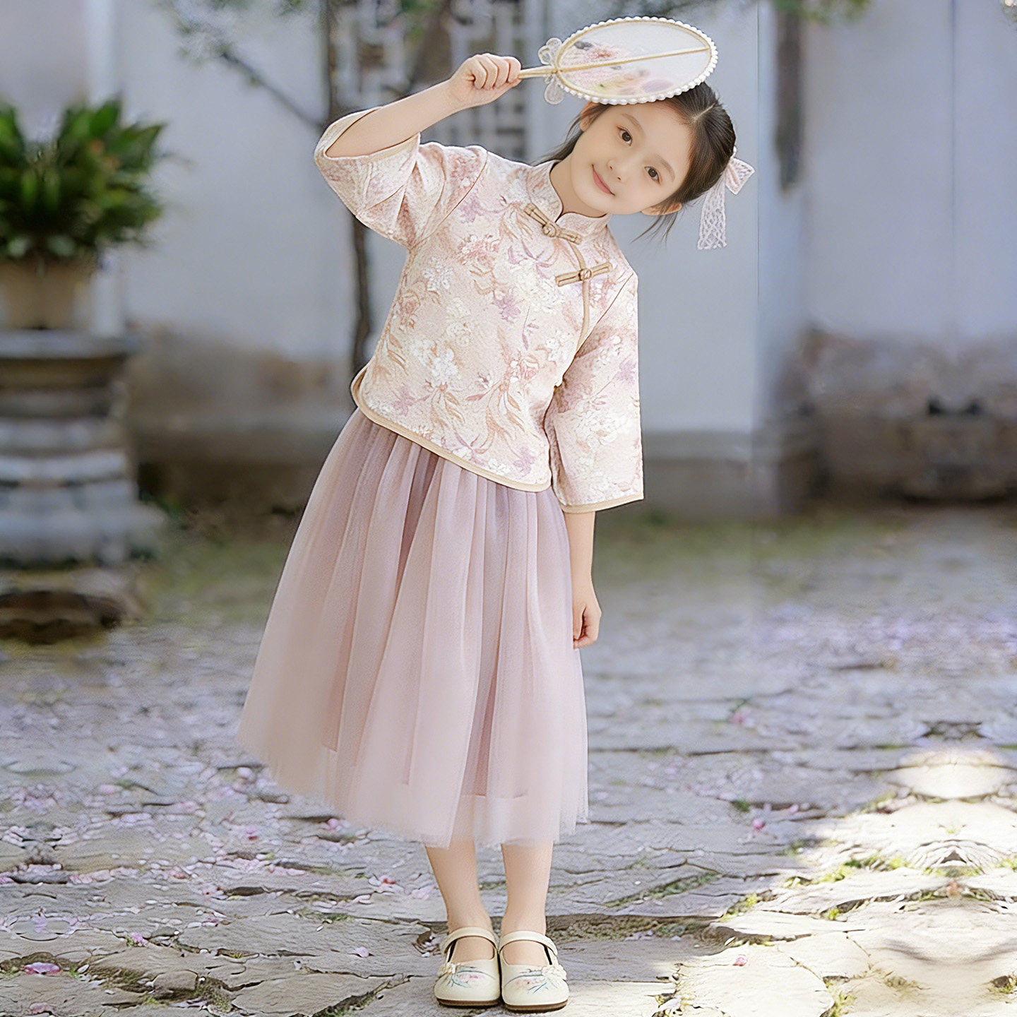 女童新中式汉服套装2026春装儿童中国风盘扣上衣网纱半身裙两件套