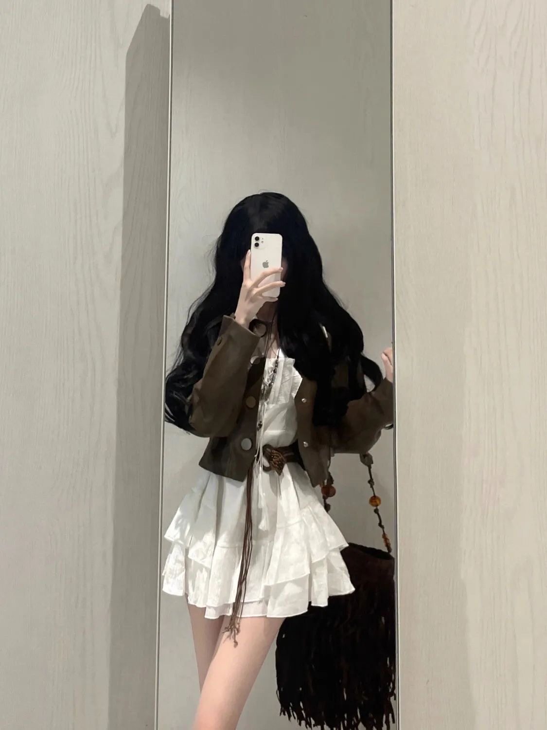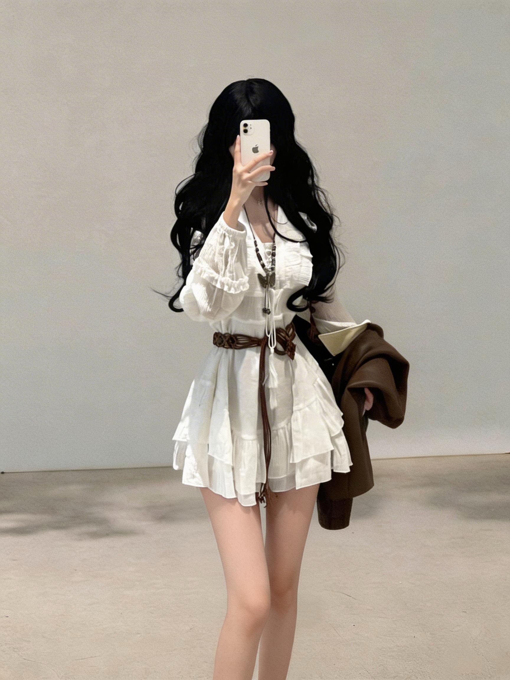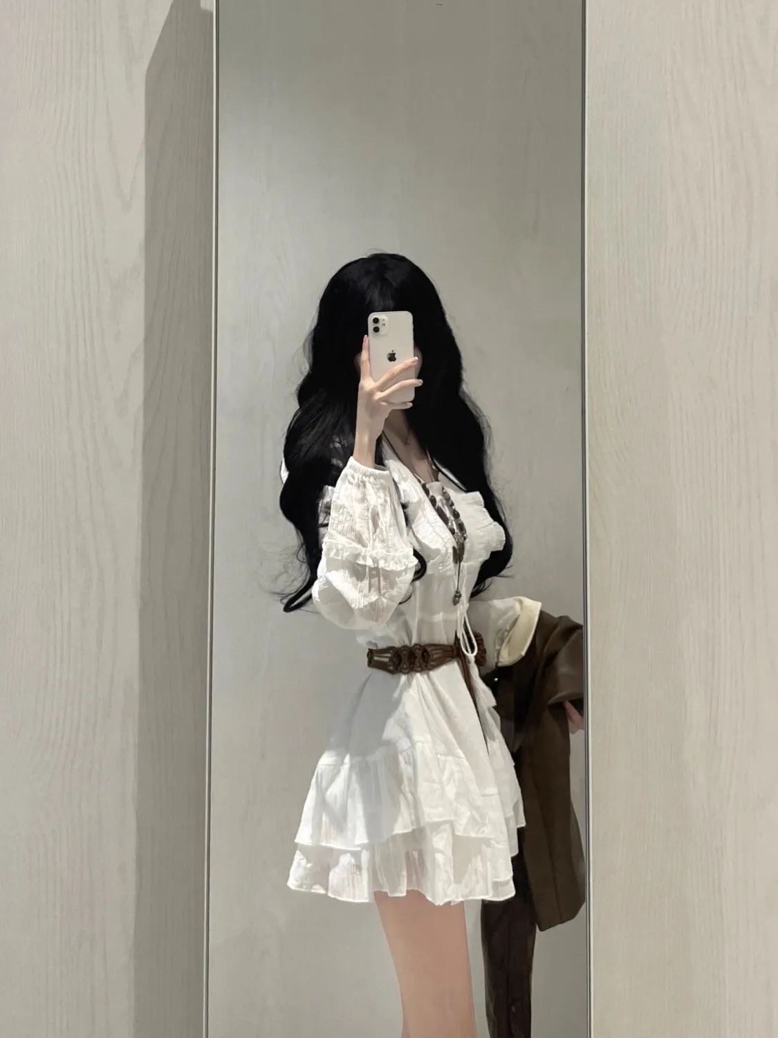 法式初恋白色内搭长袖连衣裙子女设计感收腰小个子仙女短裙早春季
