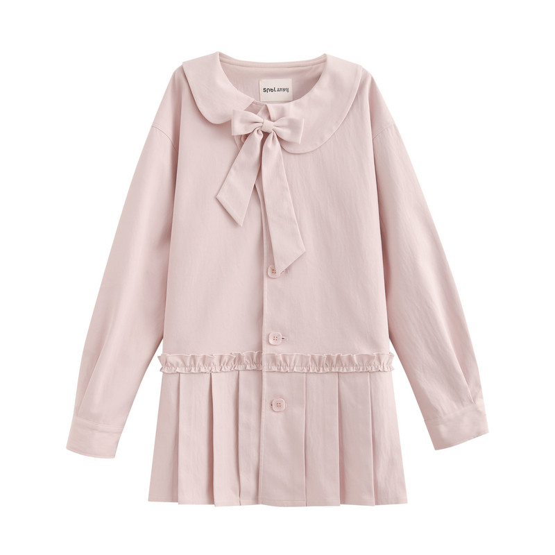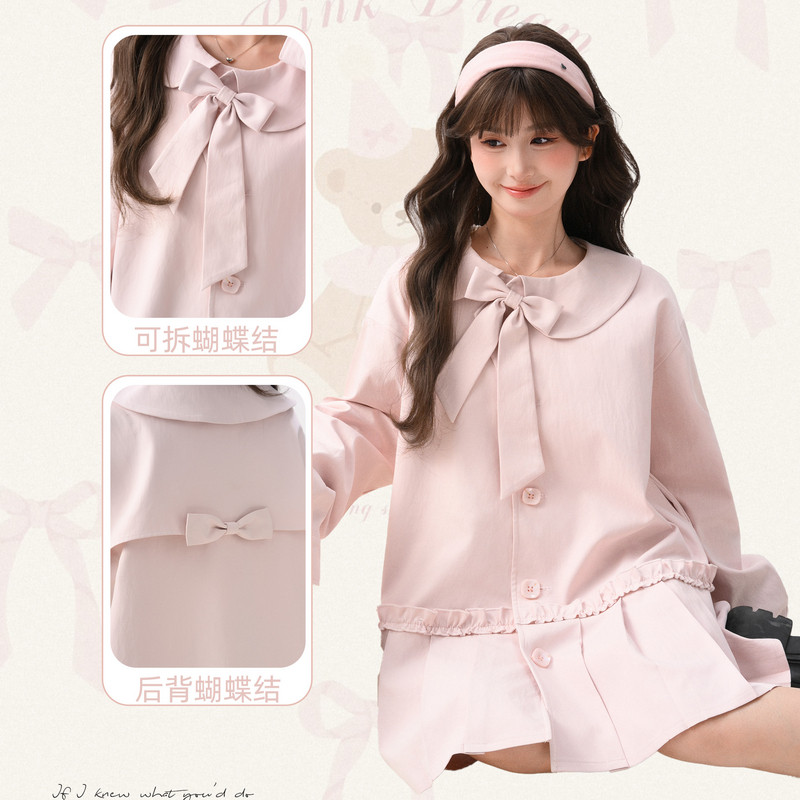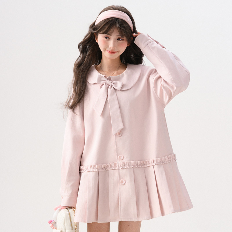 森女部落甜美风娃娃领宽松百搭粉色长袖风衣连衣裙女2026新款春季
