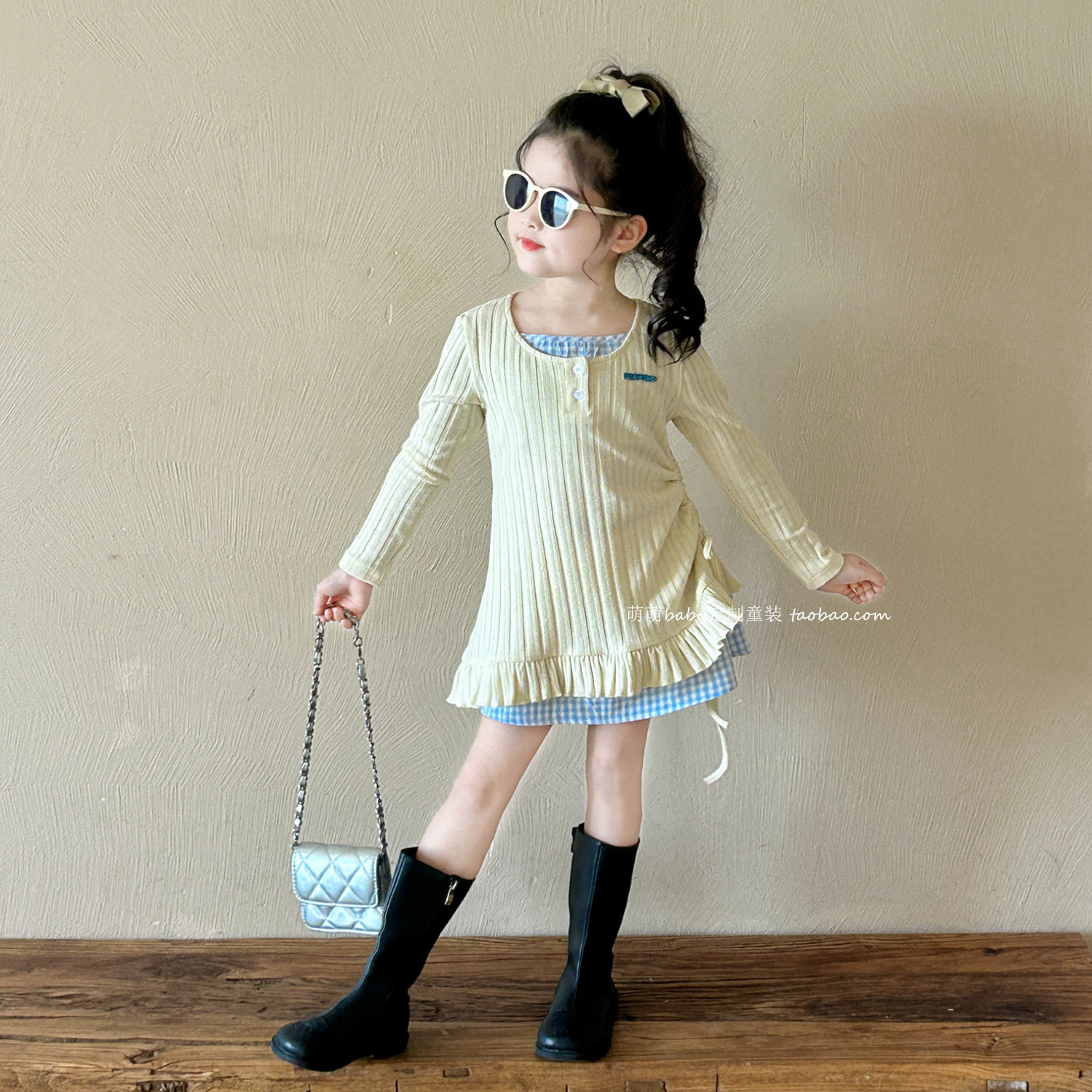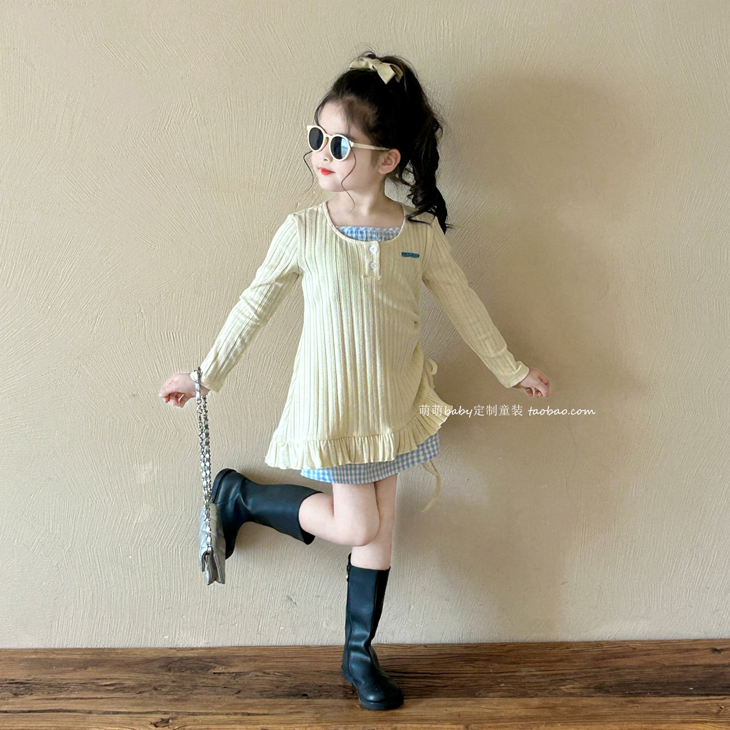 女童洋气假两件针织长袖T恤连衣裙2026春季新款小女孩甜美裙子
