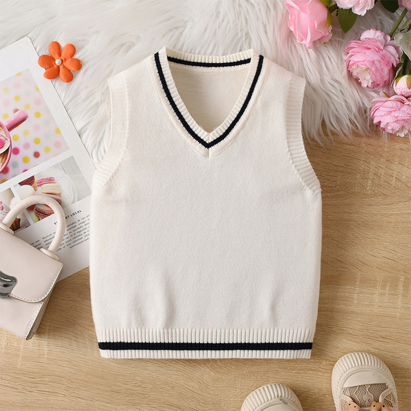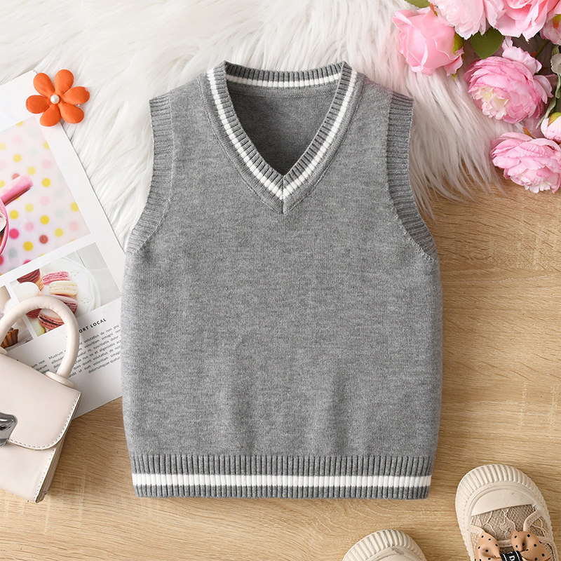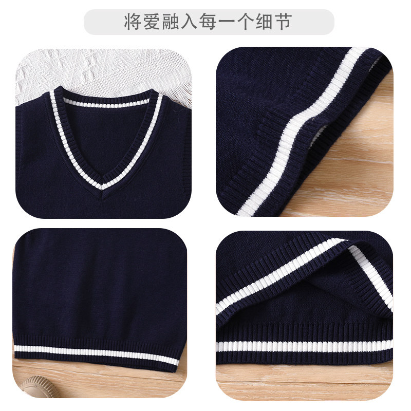 男女童学院风V领针织背心马甲宝宝无袖毛衣坎肩深蓝色条纹