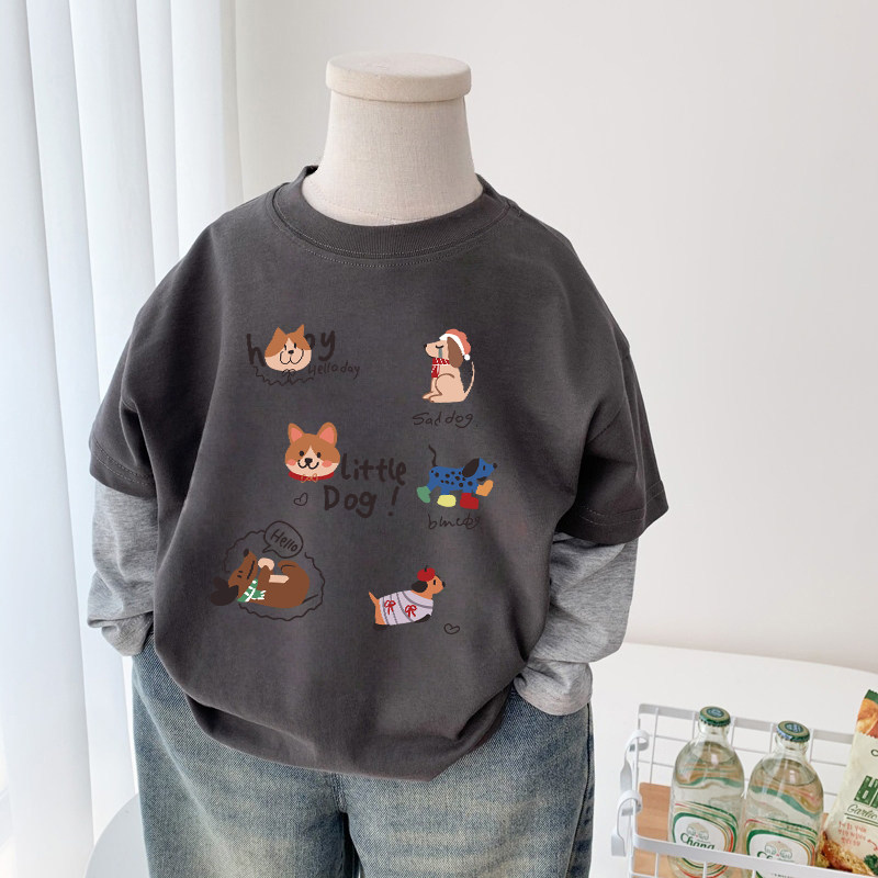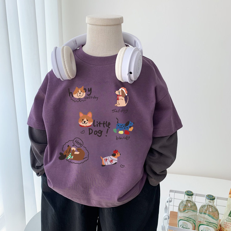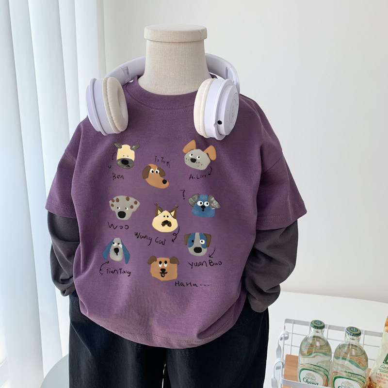 男童t恤长袖纯棉春装2026新款痞帅男孩卡通印花假两件圆领上衣潮T