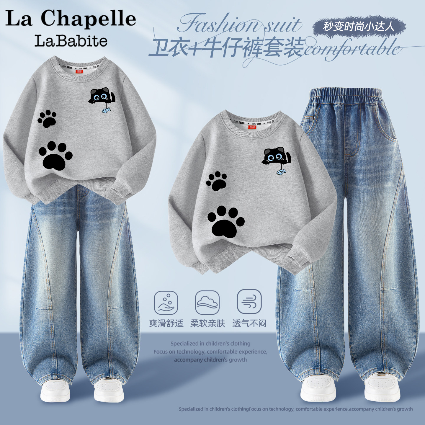 拉夏贝尔男童春装套装薄款2026新款春秋款男孩卫衣儿童运动牛仔裤