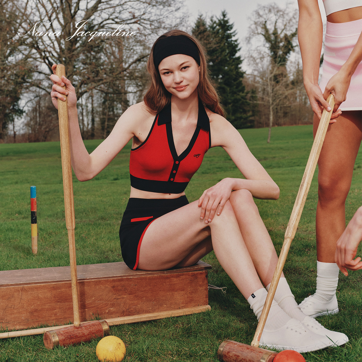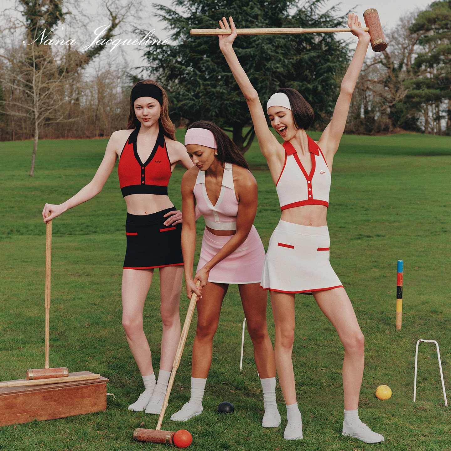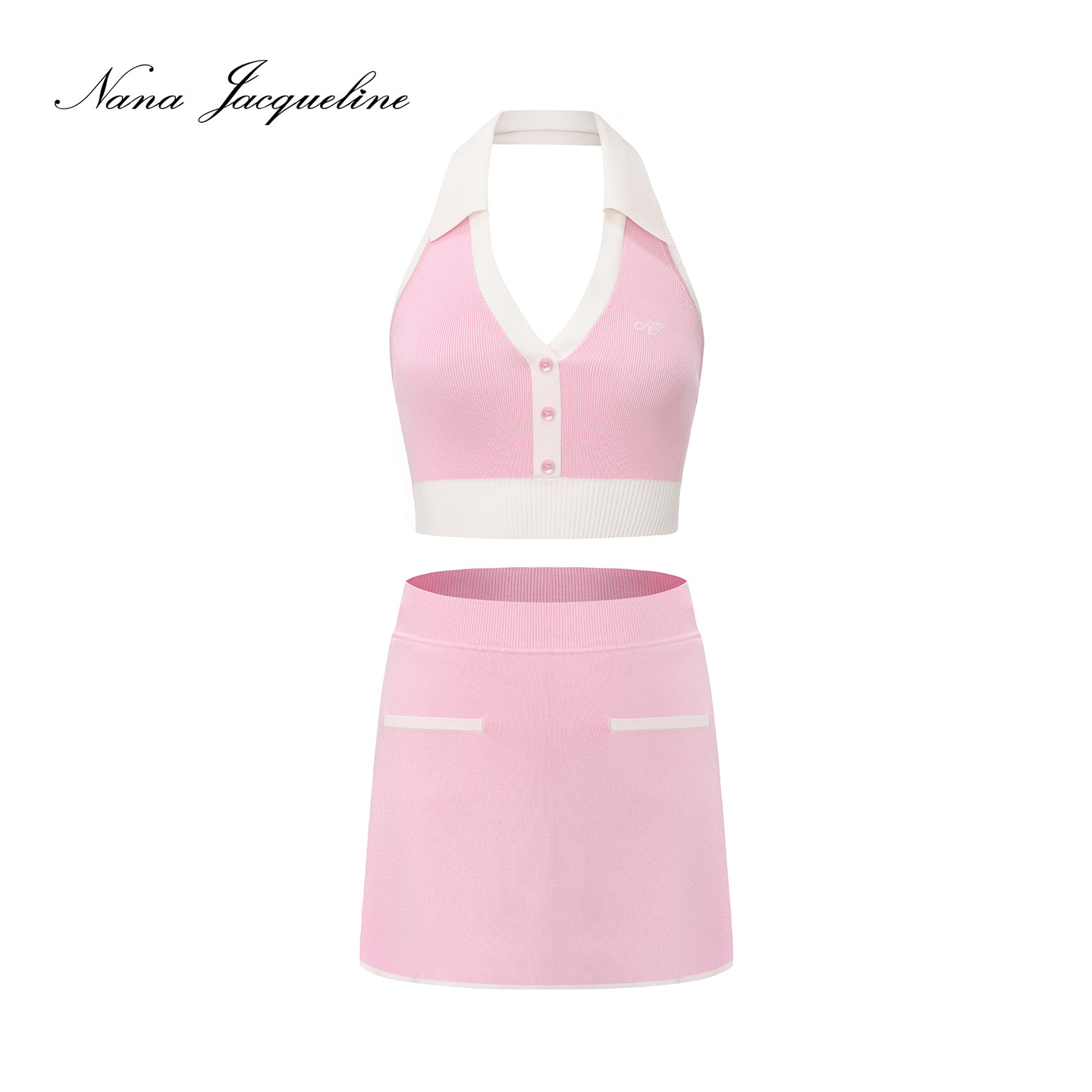 NanaJacqueline春季新款拼色挂脖时尚套装女上衣复古运动网球槌球