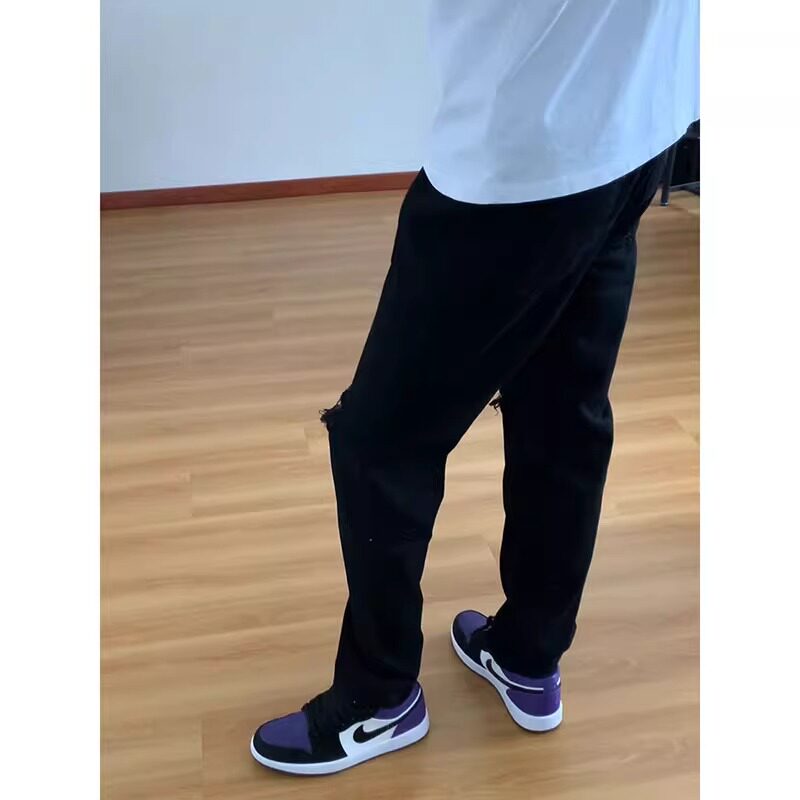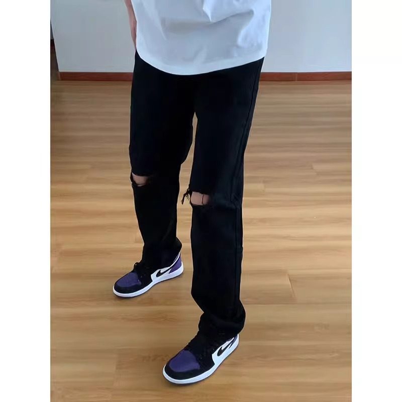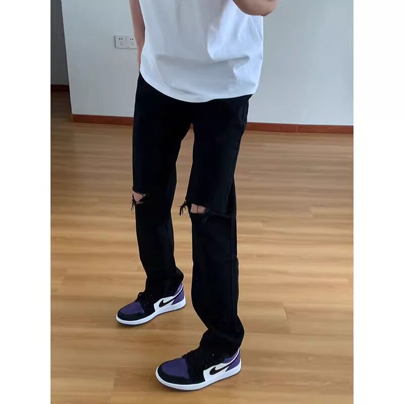 黑色膝盖破洞牛仔裤男款夏季美式高街vibe裤子直筒修身弯刀微喇裤