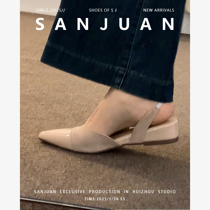 羊皮版sanjuan三卷尖头凉鞋女夏外穿包头半拖鞋法式低跟单鞋裸色