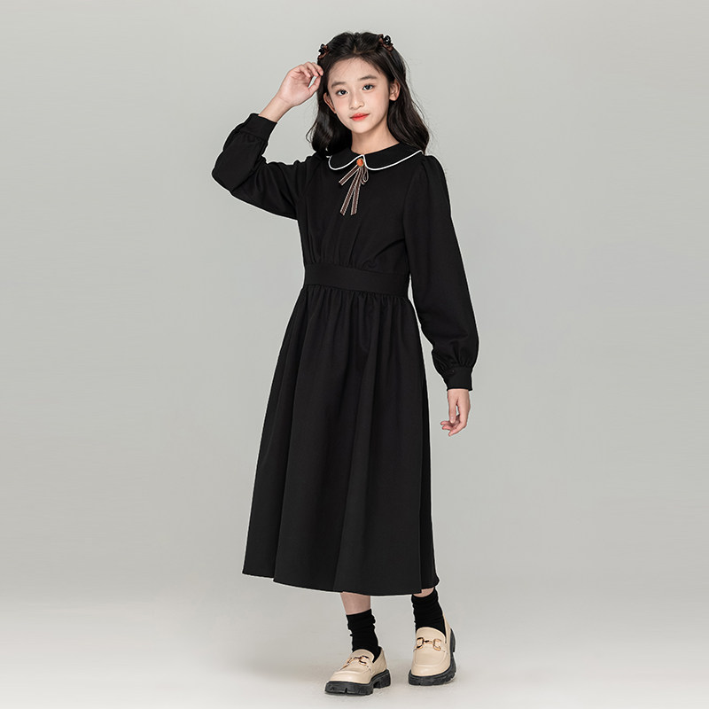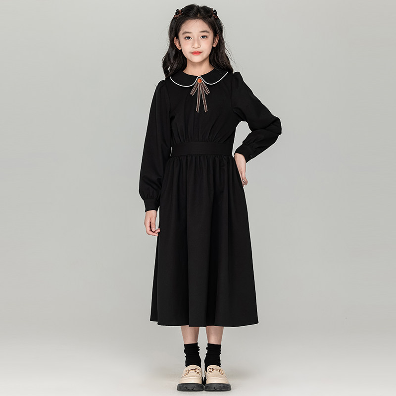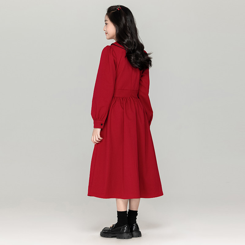 中大女童红色连衣裙2026新款长袖裙子女孩洋气娃娃领收腰气质秋冬