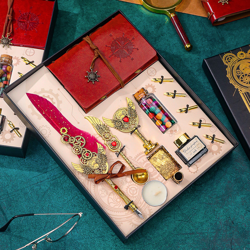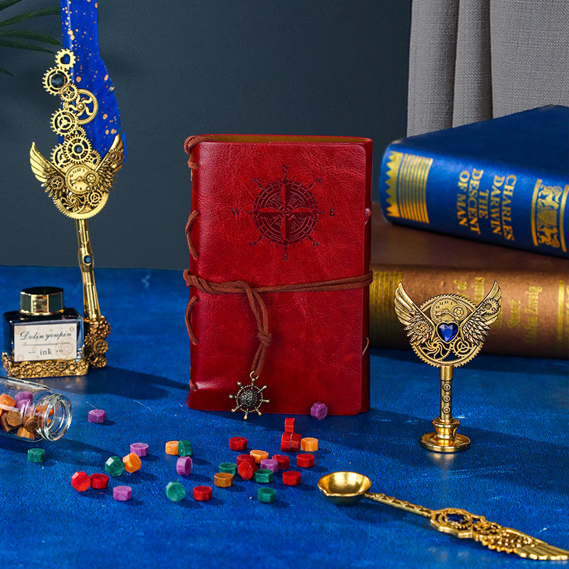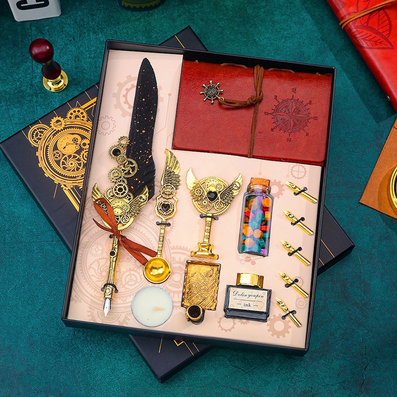 韵轩欧式复古笔记本子礼盒牛皮纸内页手账本文艺古风记事本朋克机械洒金羽毛钢笔哈利波特火漆印章教师节礼物