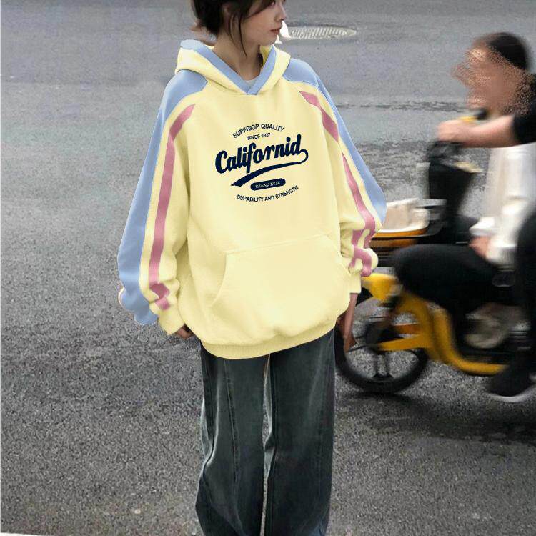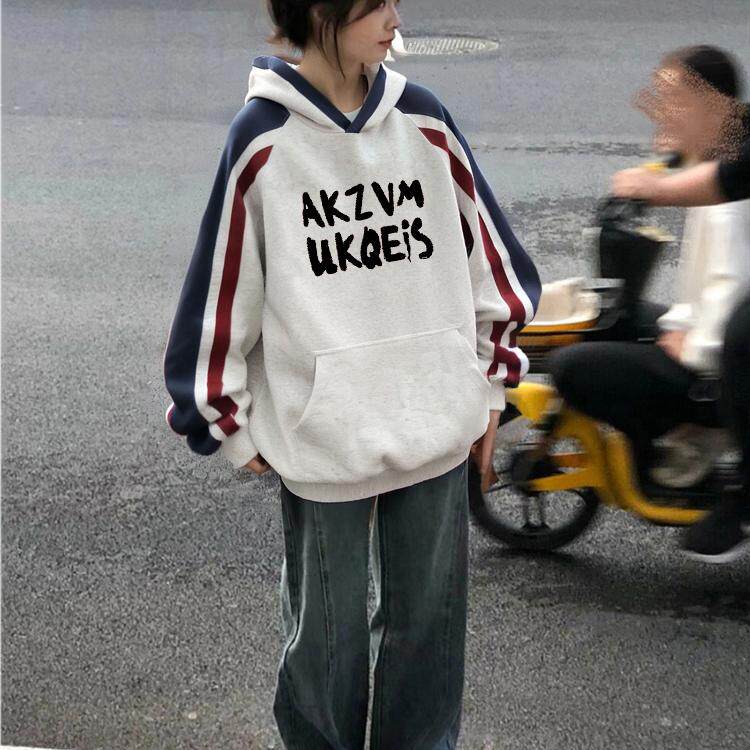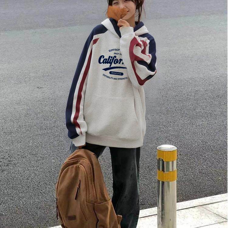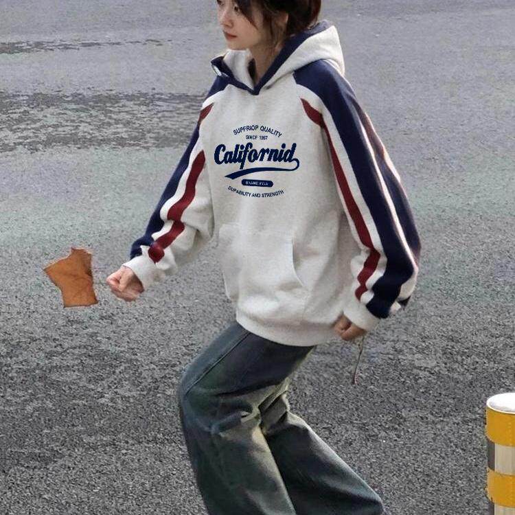 流行美式撞色卫衣女款小众不撞款宽松休闲风连帽加绒加厚外套秋冬