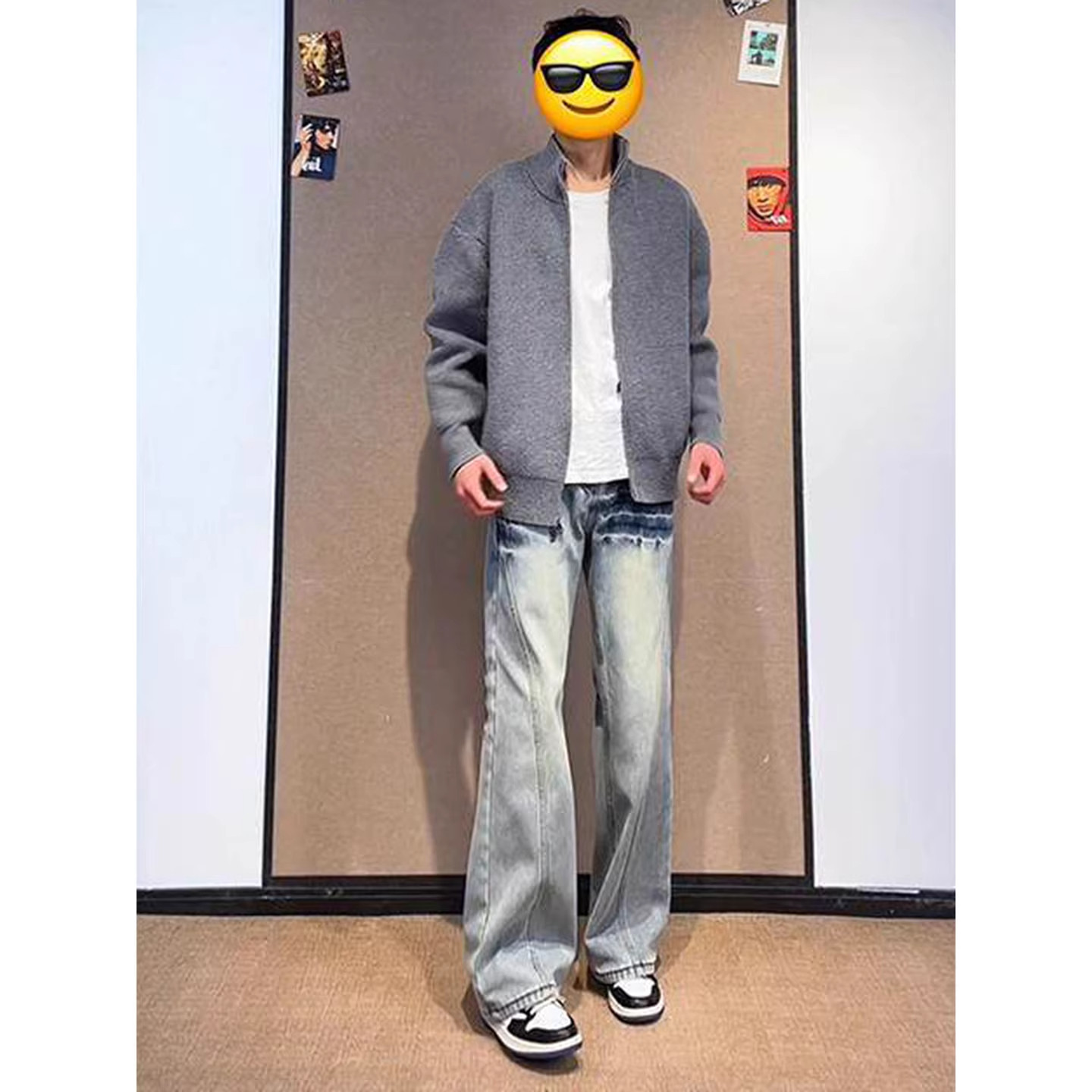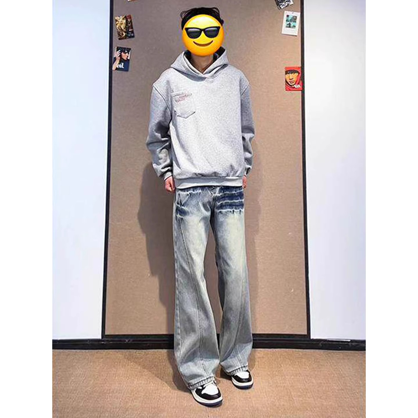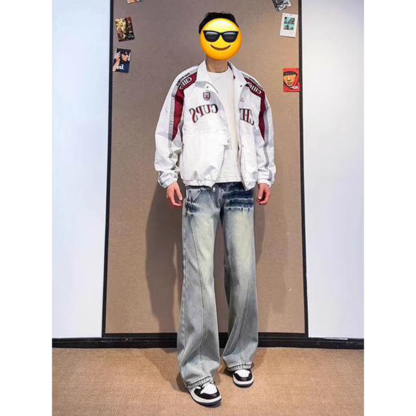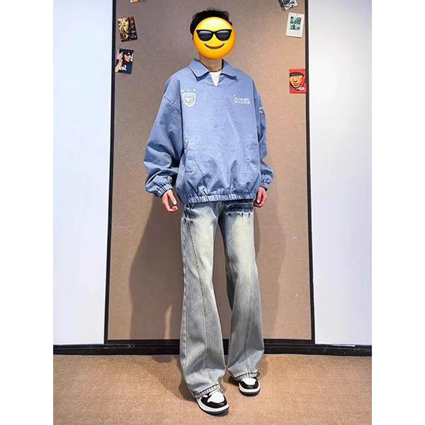 蓝色闪电裂纹斜切牛仔裤男女款情侣弯刀微喇裤子高街美式直筒长裤