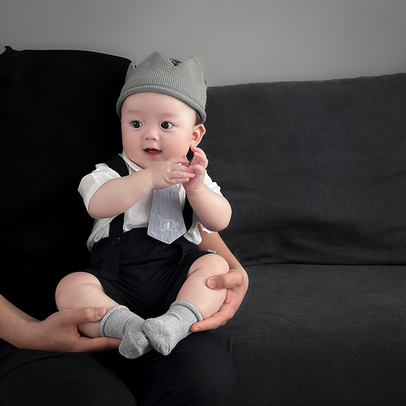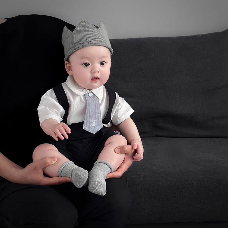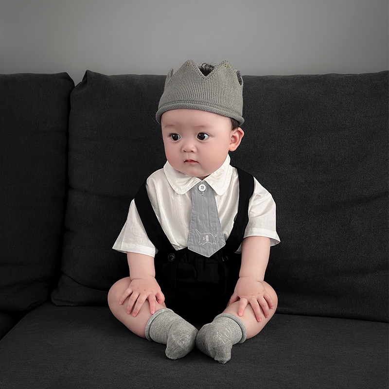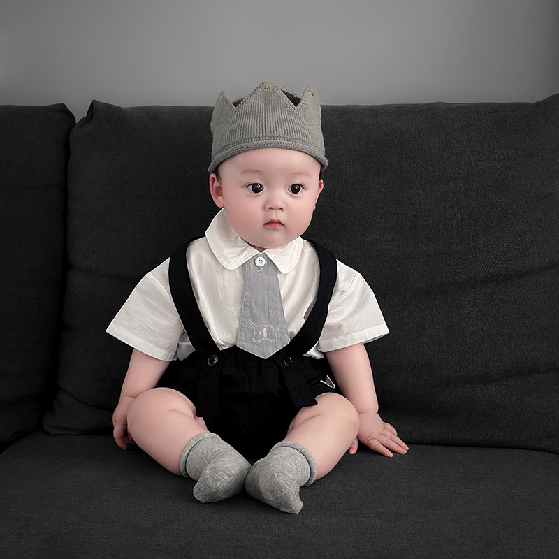 男童周岁礼服夏季套装宝宝学院风领带短袖衬衫婴儿背带短裤两件套