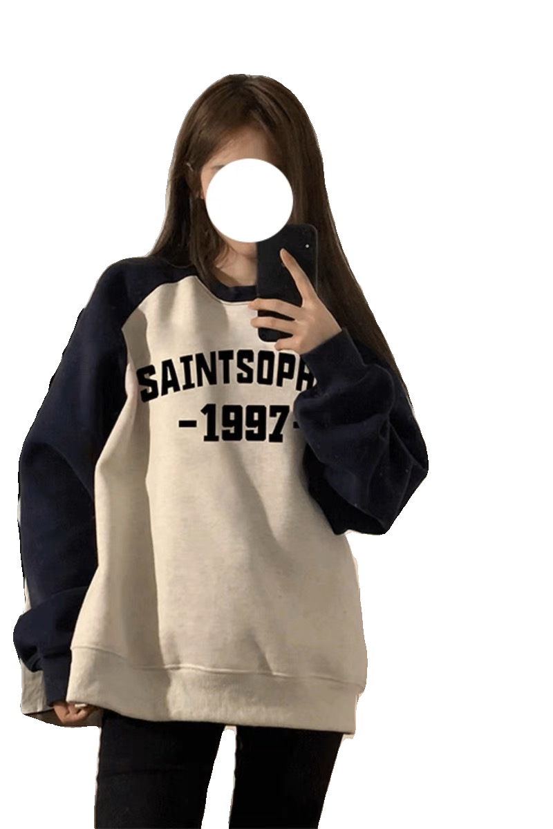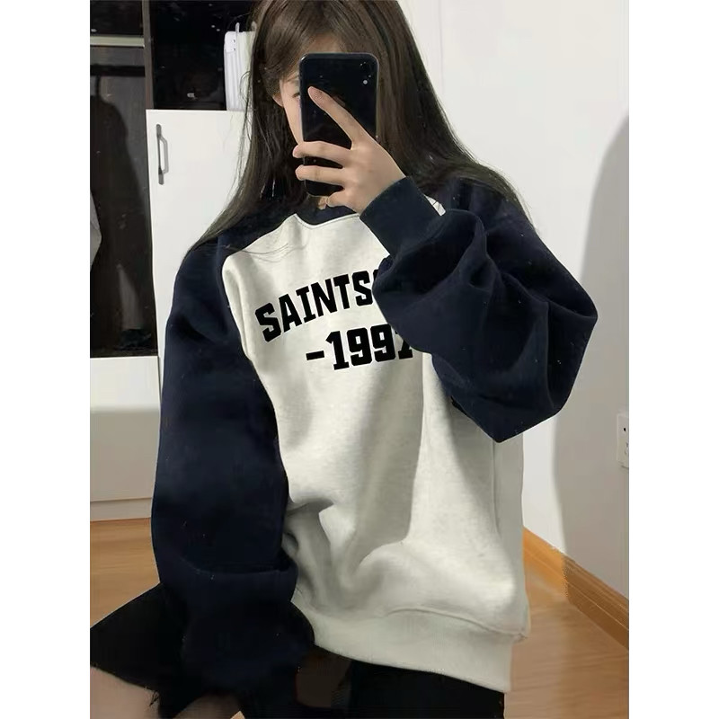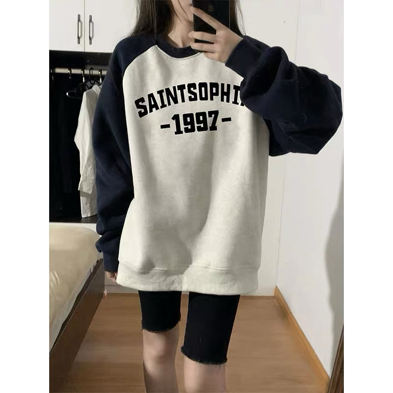 加绒大码胖MM插肩拼色圆领卫衣女秋冬季加厚中长款字母外套拼接潮