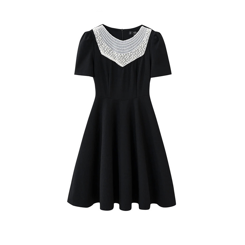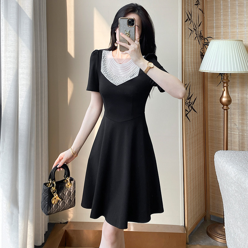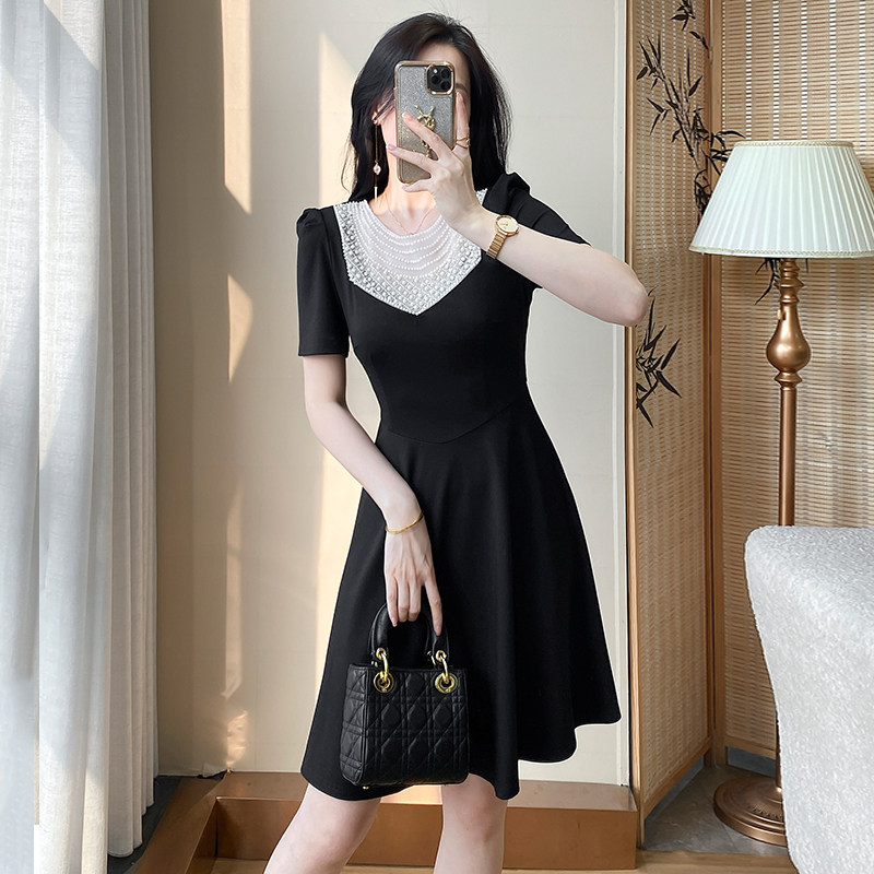小个子显高黑色连衣裙女夏新款时尚收腰高档钉珠短款a字小黑裙子