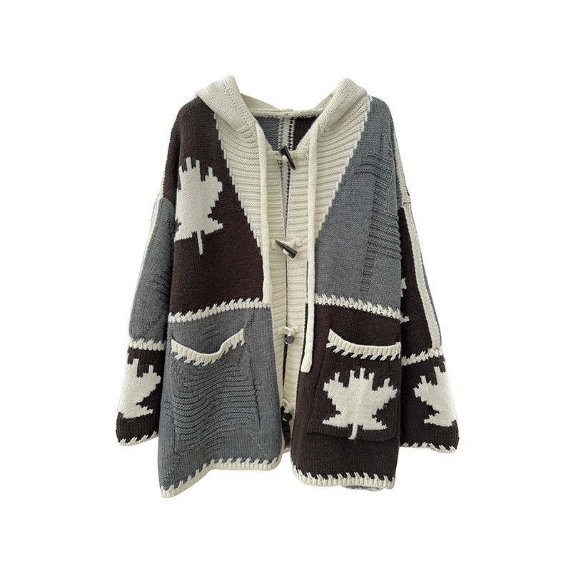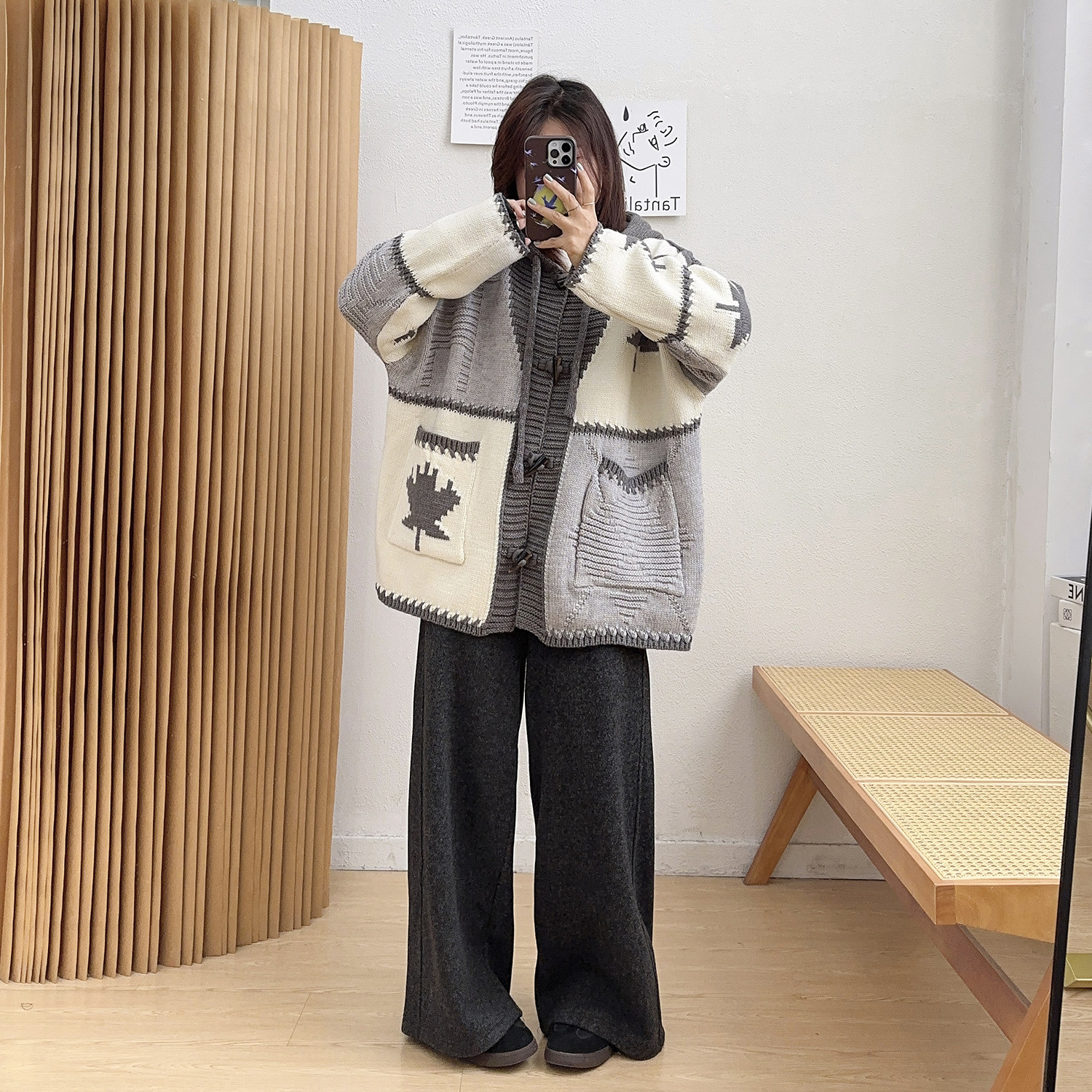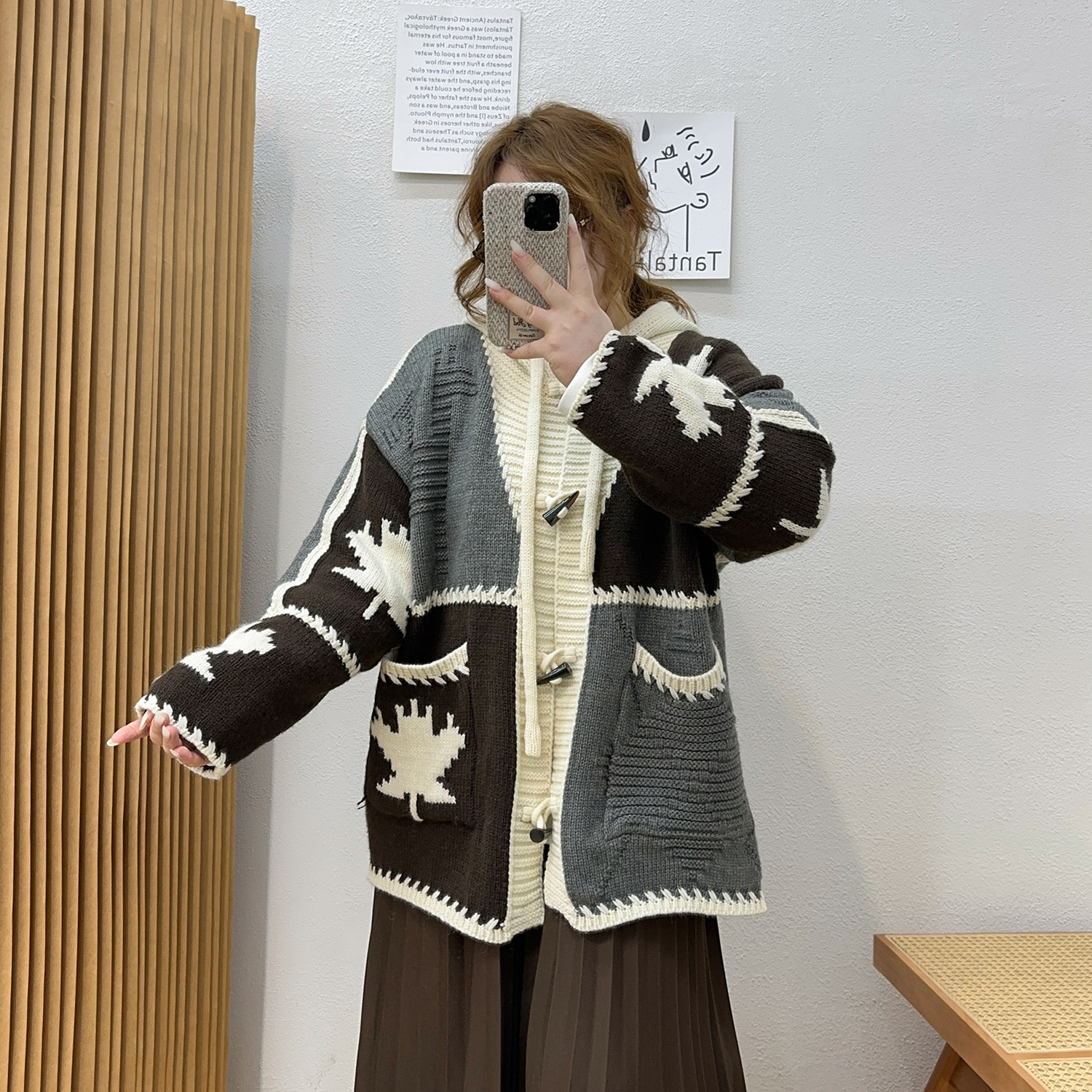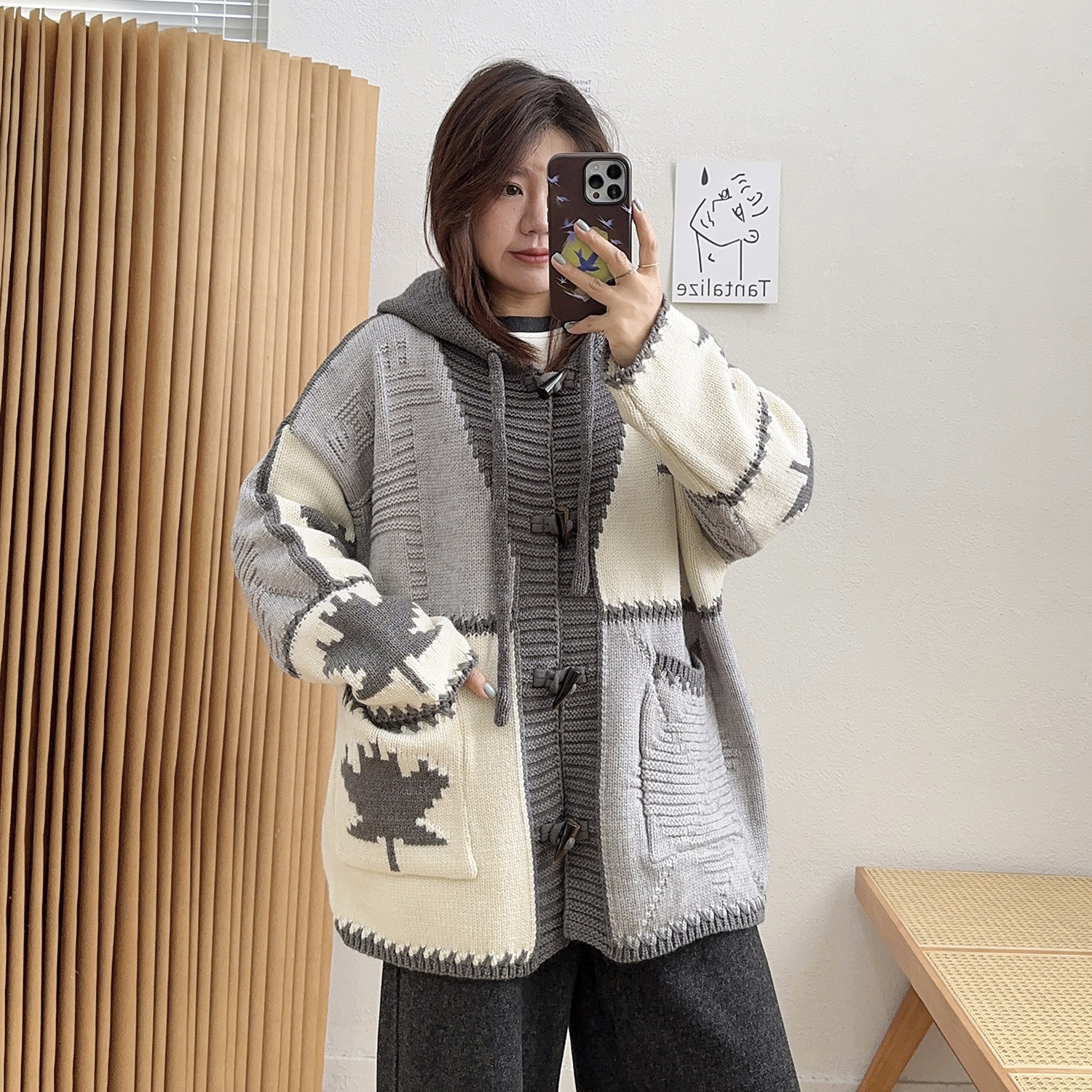 宛宛大码女装胖MM费尔岛连帽宽松慵懒牛角扣针织开衫毛衣加厚外套