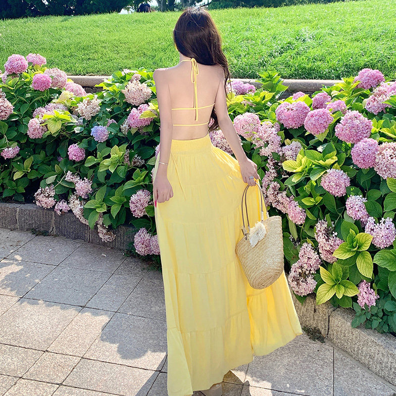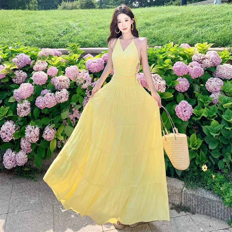 海边度假风挂脖绑带黄色连衣裙女夏立体显瘦a字裙露背性感长裙子
